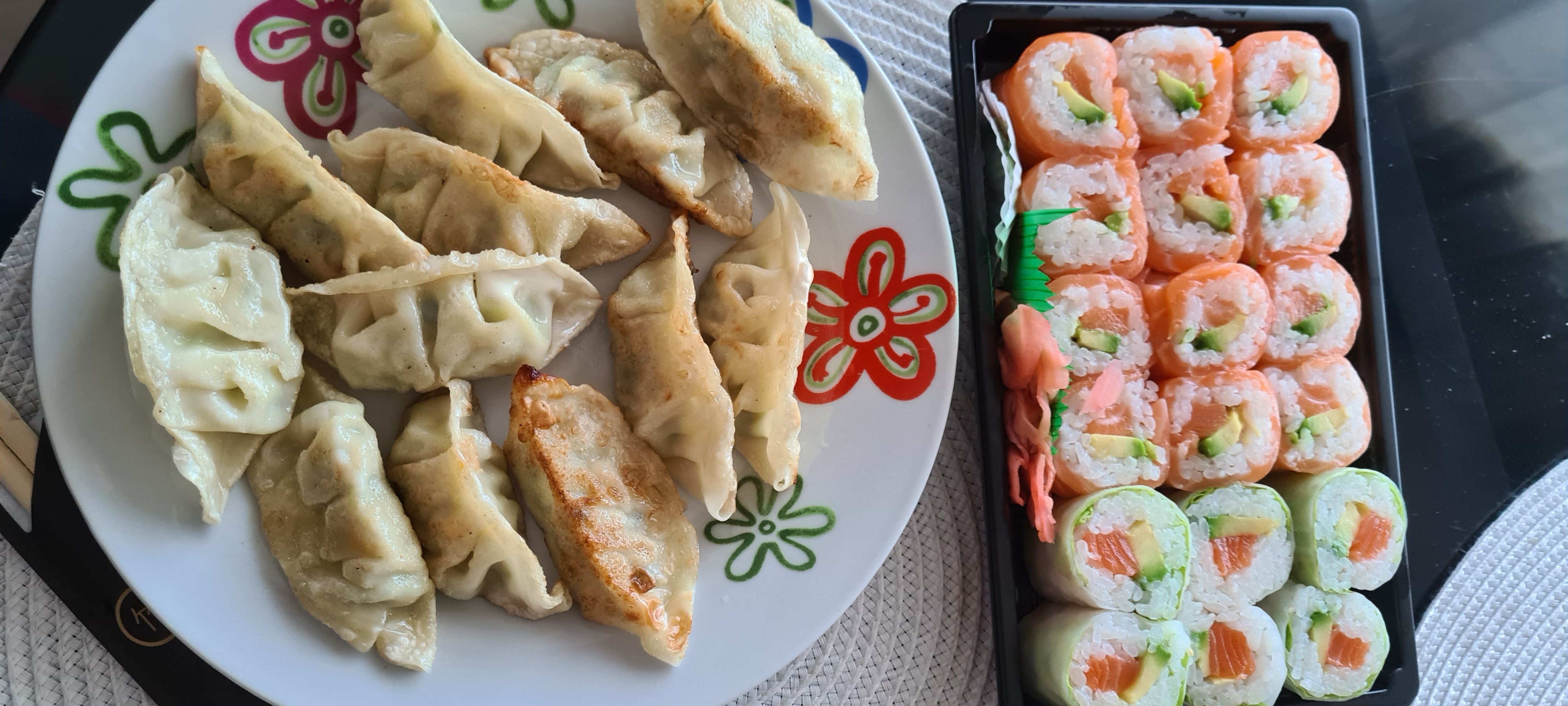 Livraison à l'heure prévue. Livreur sympathique. Prix assez correct. Les raviolis malheureusement pas assez cuits. Présentation des Sushis rien à dire, dommage que le riz tombait et le saumon trop gras. Baguettes et sauce fournie avec, seulement la sauce pour ma part ça passait pas.