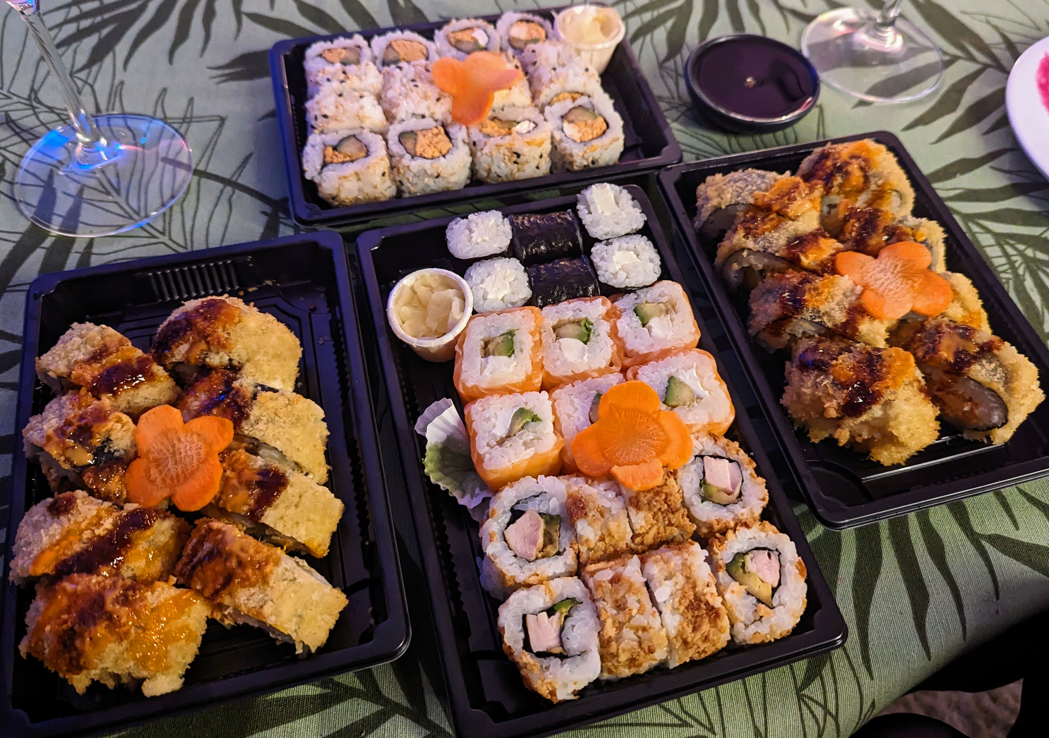 J'avais envie de sushi alors j'ai eu une boîte de sushi à emporter et c'était délicieux ! Frais et pas cher, ce n’est pas très chic mais ça fait l’affaire.