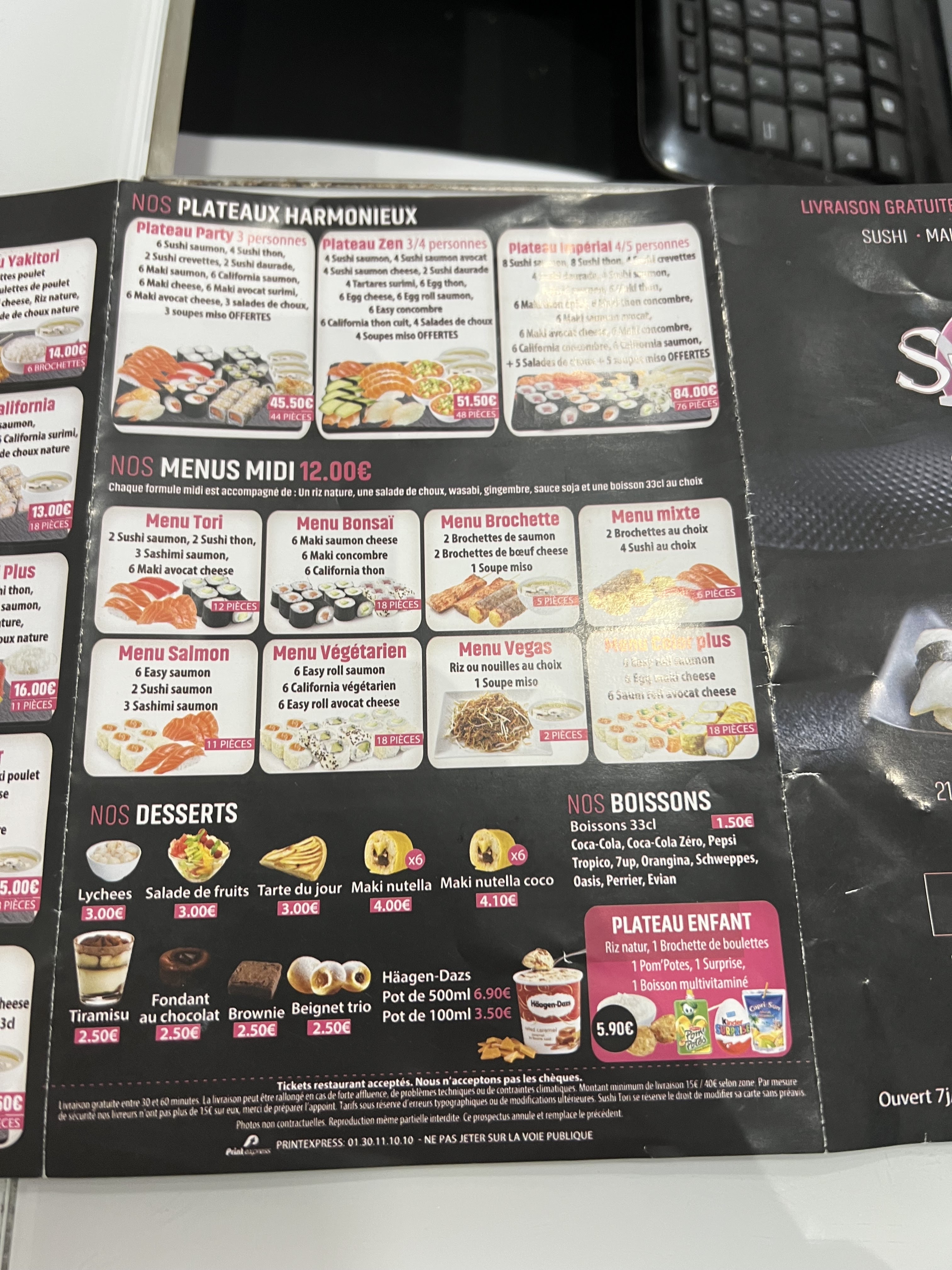 J'y suis actuellement il n'ont de sushi que le nom les brochettes sortie du congélateur direct dans la friteuse le wasabi en tubes perso la moutardes à plus de goût et un plateau un 15€ vive le bénéfice même chez emaus je mettrai pas plus de 5€ en clair déçu pas bon et chère
