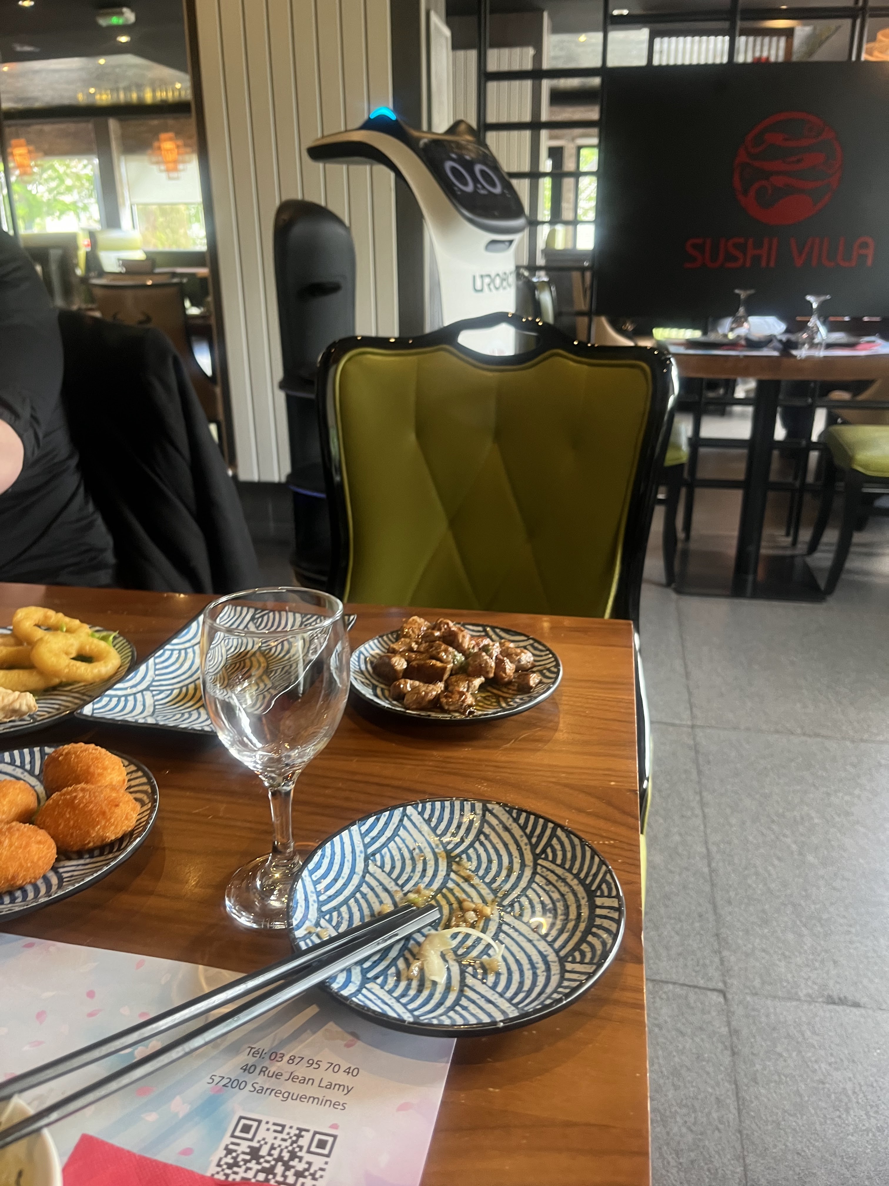 Restaurant japonais, très correct, la cuisine est bonne, il y a un ou deux robot qui vous amène les boissons et les plats si vous n'êtes pas trop nombreux. Nous étions huit, il nous a amené les apéros, le reste nous à été servi. Vous commandez les plats(belles variétés)sur une tablette et on vient vous servir, c'est à volonté, vous pouvez commander 5 plats par personne toutes les 10 minutes. Les prix sont très correct. À midi ce samedi, nous avons payé 18,50€ par personne hors boissons. Personnellement, Cette façon de servir, me paraît plus hygiénique que le buffet ou vous vous servez et où tout le monde touche les ustensiles pour se servir.