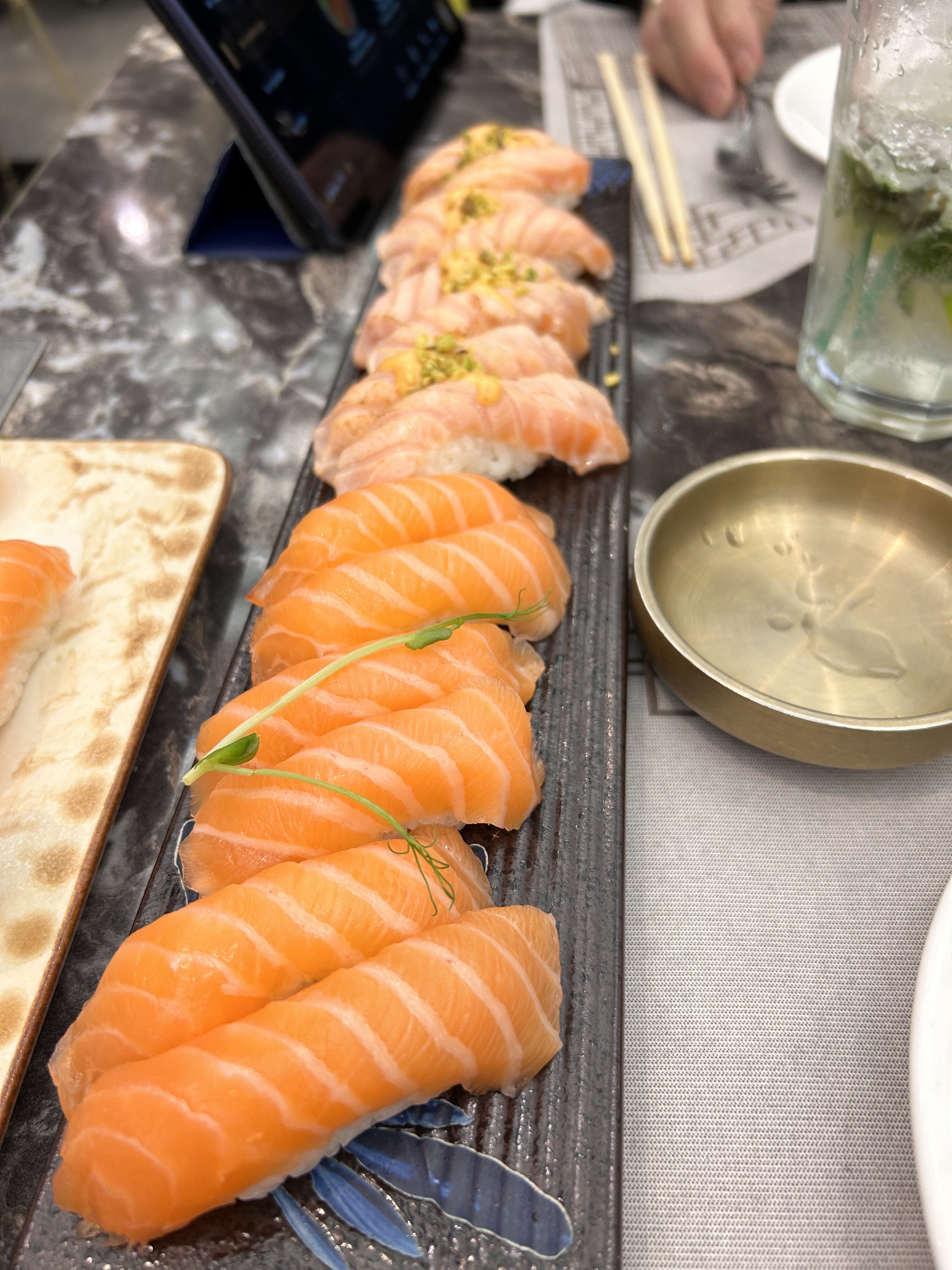 Le lieu est superbe. La carte est très variée (même si cette longueur ne vient que des multiples petites variations entre chaque plat), on sort du classique sushi/maki et on découvre avec plaisir de l'anguille, st Jacques, surprenantes associations avec de la fraise ou de la mangue... Nous étions arrivés tôt, donc tout s'est bien enchaîné, mais je pense que si la salle (qui est grande) est pleine ça doit être compliqué. Seul bémol : j'aime ces plats bien froids, certains étaient presque à température ambiante. Mais super, nous reviendrons, c'est sûr !