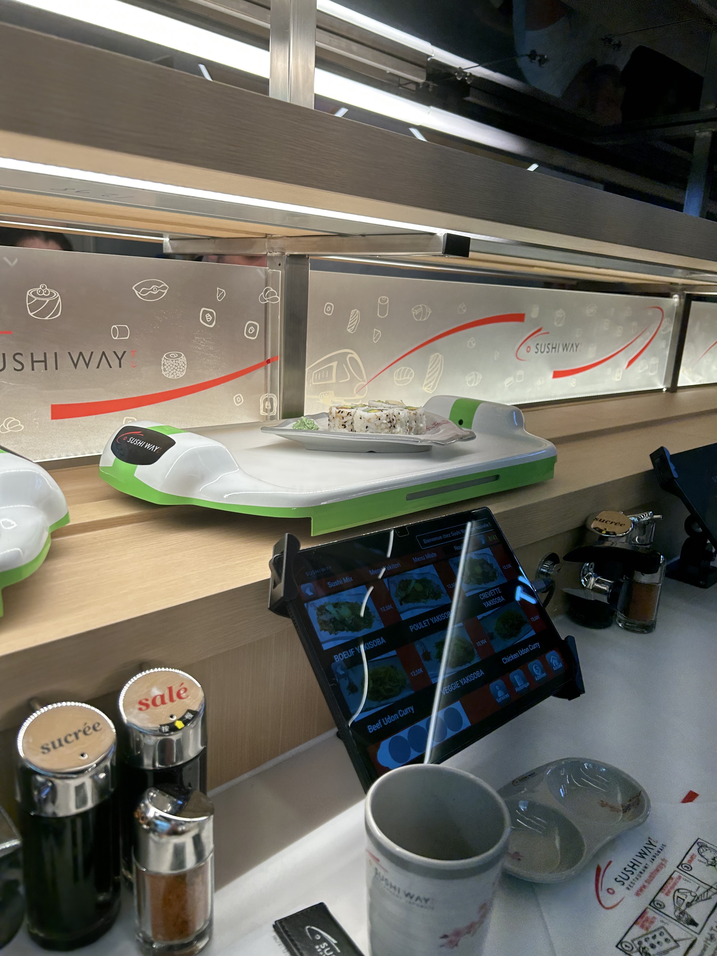 Je ne m'attendais pas à cela!! Je pensais que un seul menu ne suffirait pas en tant qu'habitué des restaurants à volonté,mais les sushi et les gyoza ont suffi!!les sushi sont très grand comparé à ceux qu'on a l'habitude de voir👍🏾👍🏾le seul soucis que quand nous sommes moins de 4 nous mangeons alignés,ce qui faut que nous sommes collé avec d'autres mais sur le moment on s'y habitue!!(j'ai consommé un menu à 12€80 contenant 6 California saumon avocat,6 maki saumon🍣 6 gyoza poulet🥟 et une salade de chou+ 1 bol de riz à 2€20🍚+une glace à 2€80🍦■ = 17€80 ■Mon ami à pris un menu similaire à 13€50 mais à la place des gyoza il y avait des sushi saumon+un mochi coco à 2€80 ■=16€30■ le tout nous est revenu à ●34€20●!!! Le concept du train est très bien et les plat sont servi rapidement,il est impossible de se faire voler un plat,le train avance trop vite!!JE RECOMMENDE A 96%👍🏾👍🏾👍🏾👍🏾