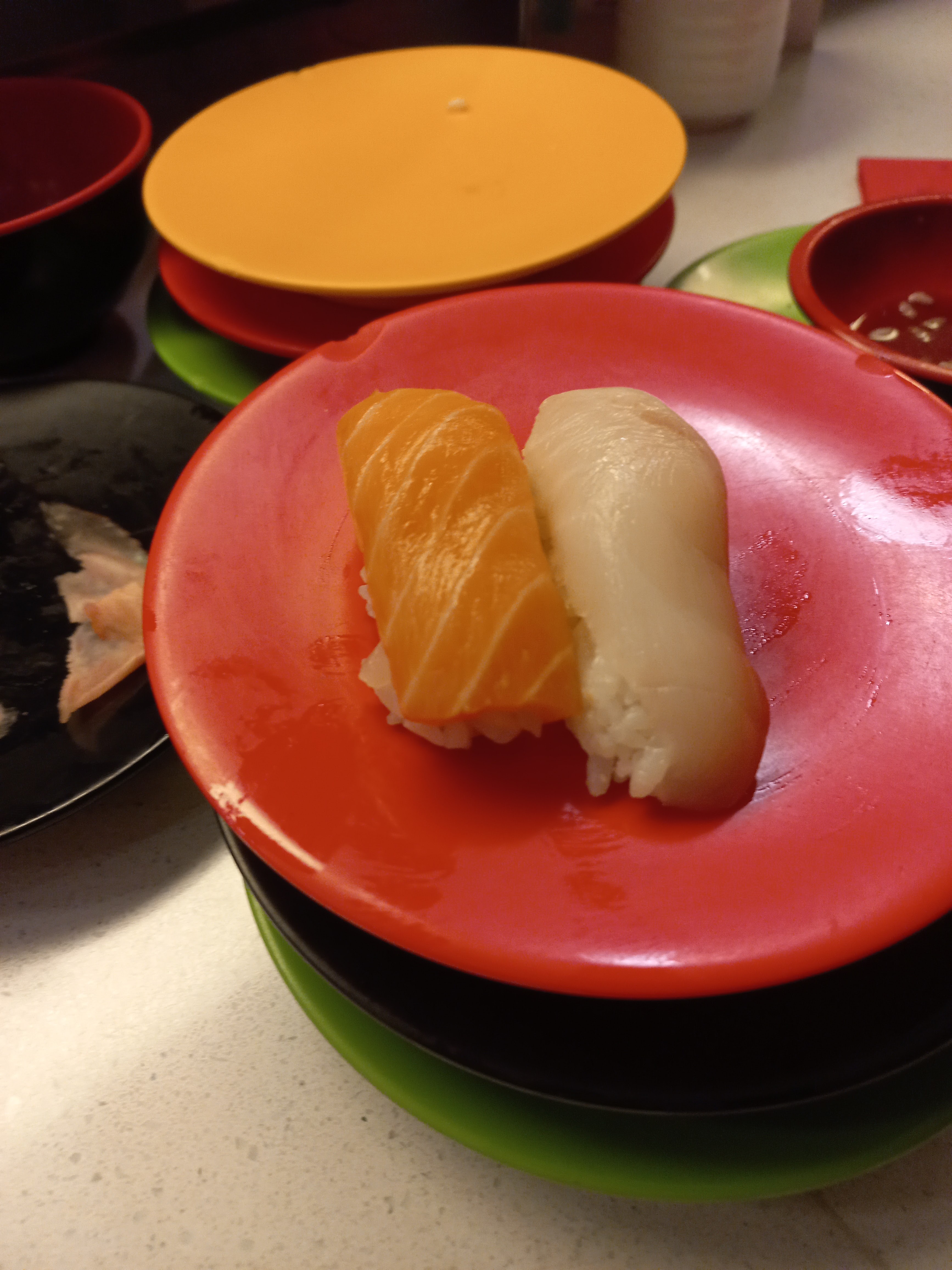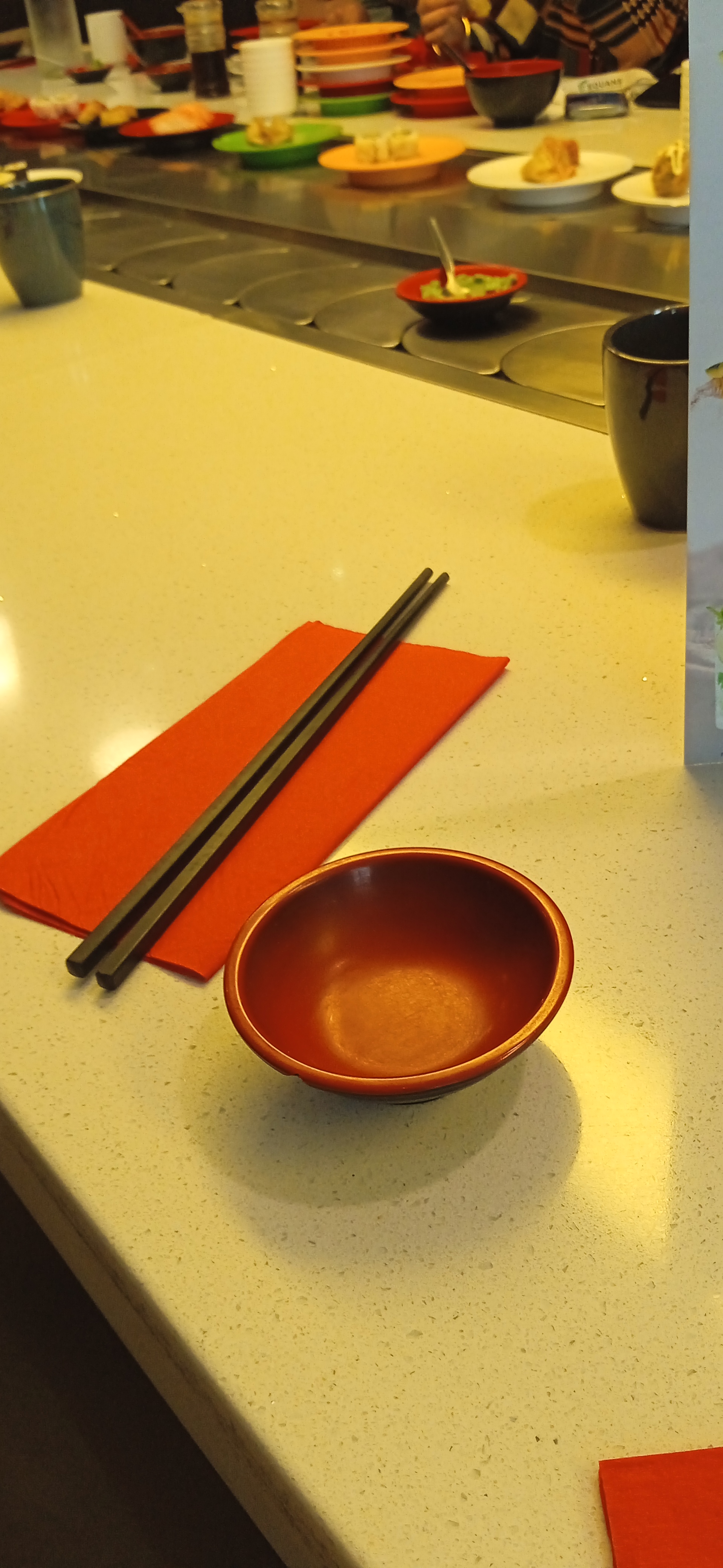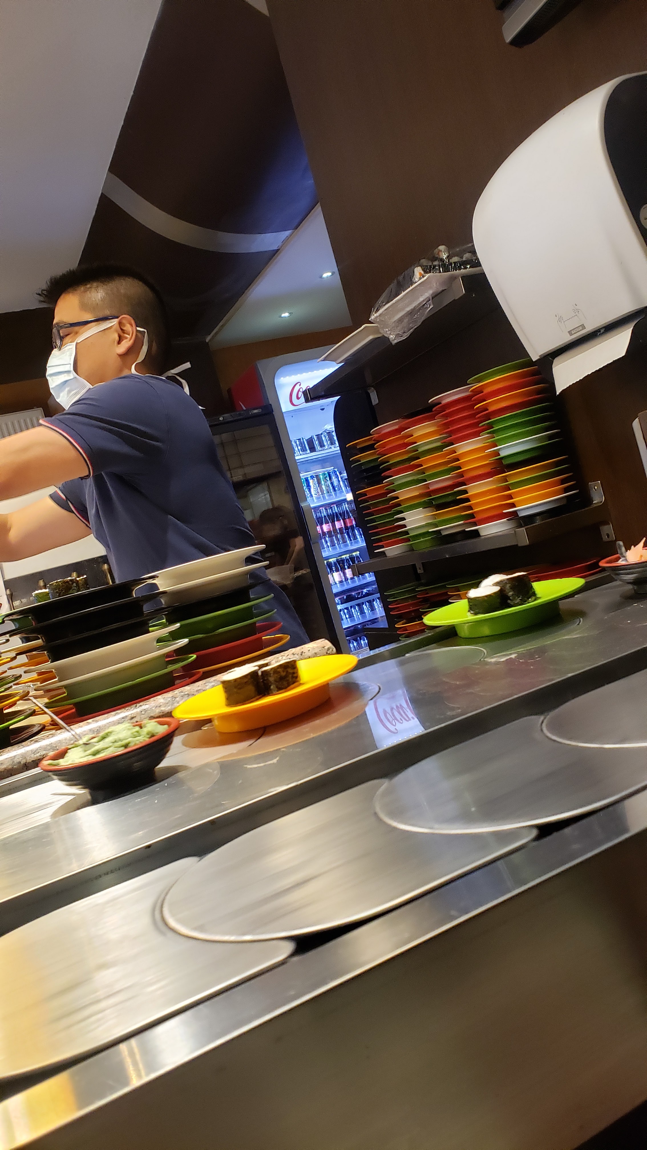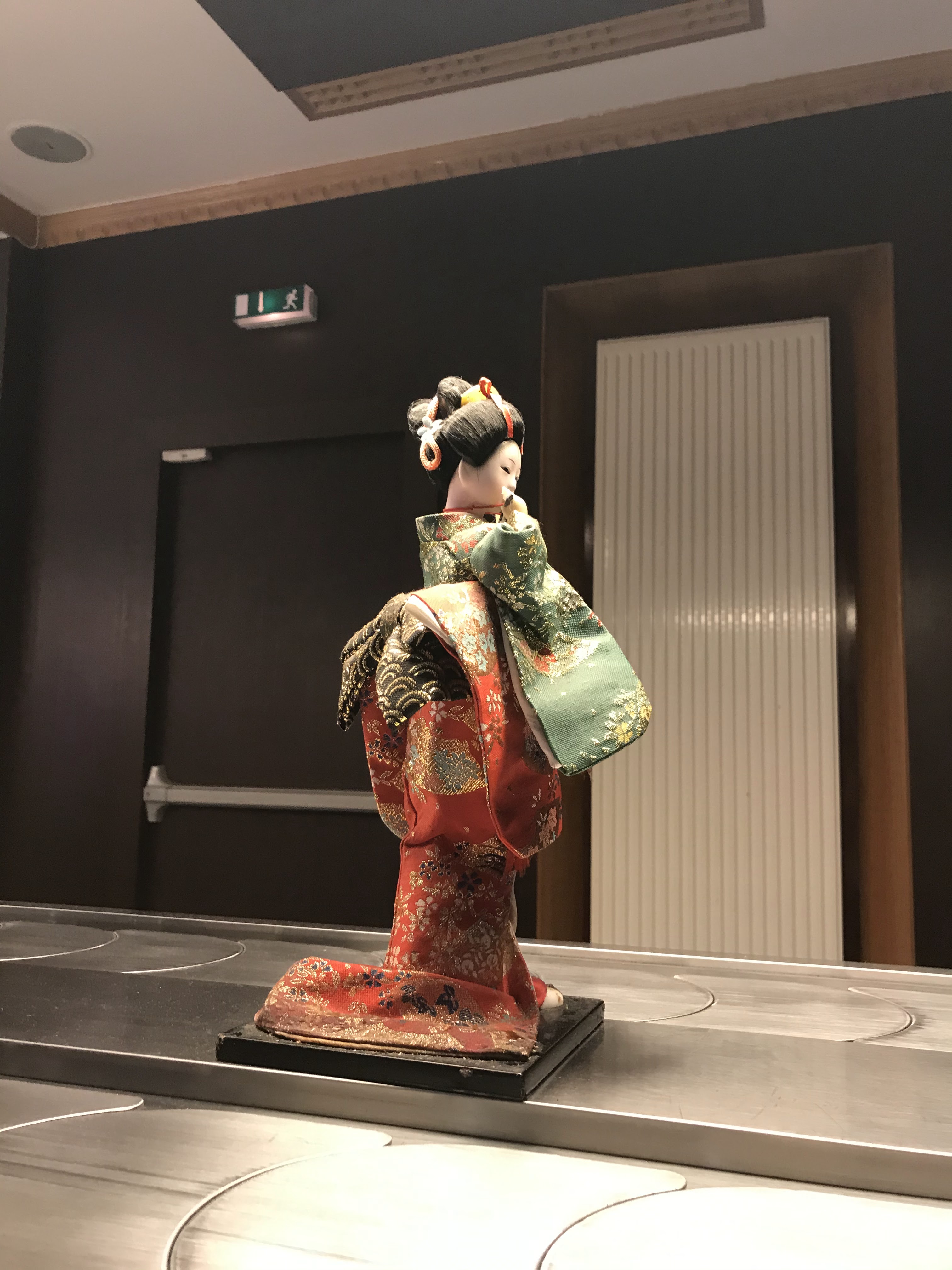Des coupelles qui tournent sur un tapis roulant, sans couvercle, visiblement depuis un moment , aspect peu appétissant. Et doute sur l’hygiène, on a fait demi-tour, appétit coupé, mais honnêtement, on n’a pas goûté, donc avis assez subjectif !