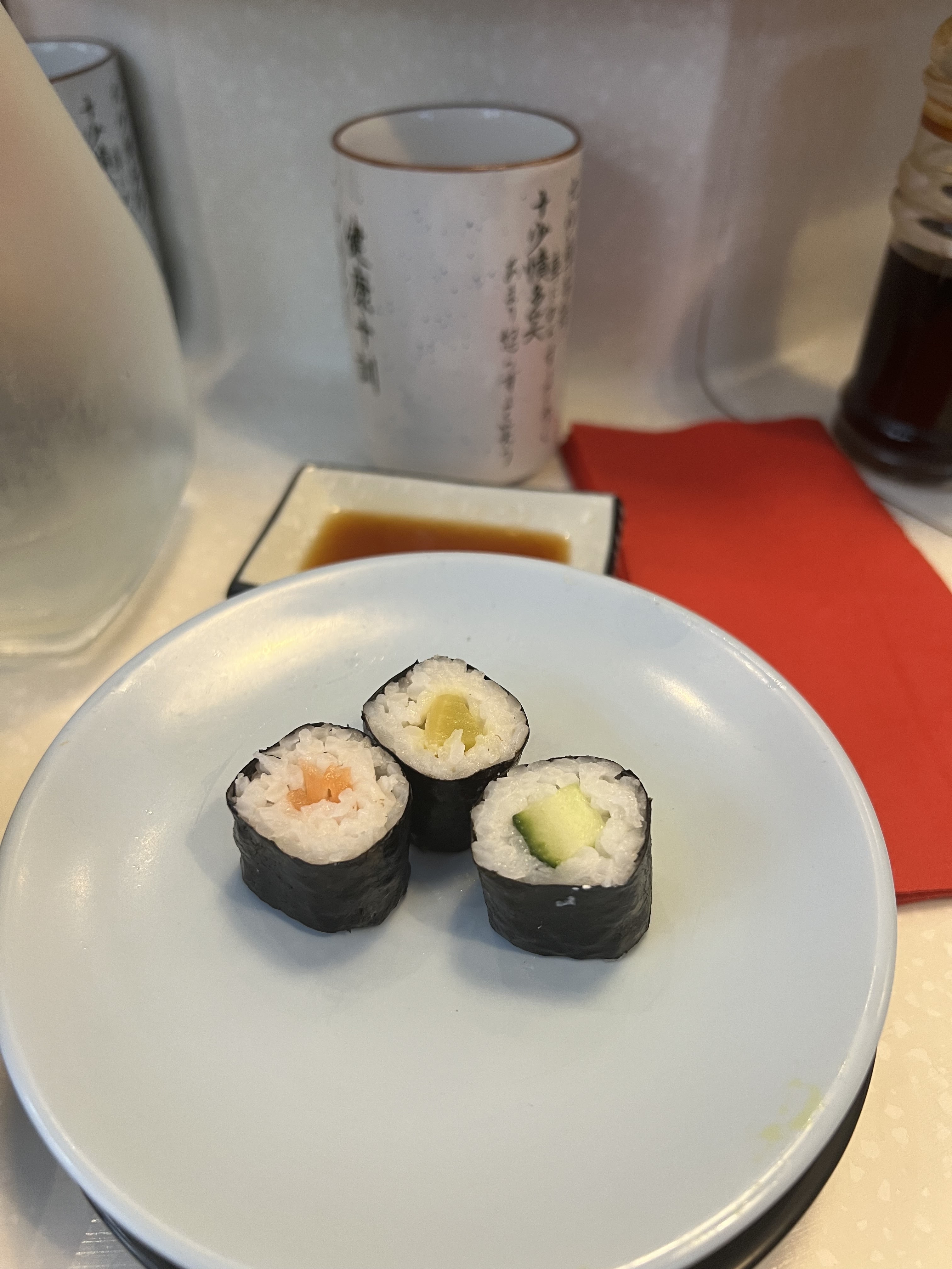 Arrivés en premier , on a vu le chef préparer les sushi en face de nous et tout était à bonne température et semblait bon. Un petite musique avec le tapis roulant ont vraiment fait le tour de l’ambiance.