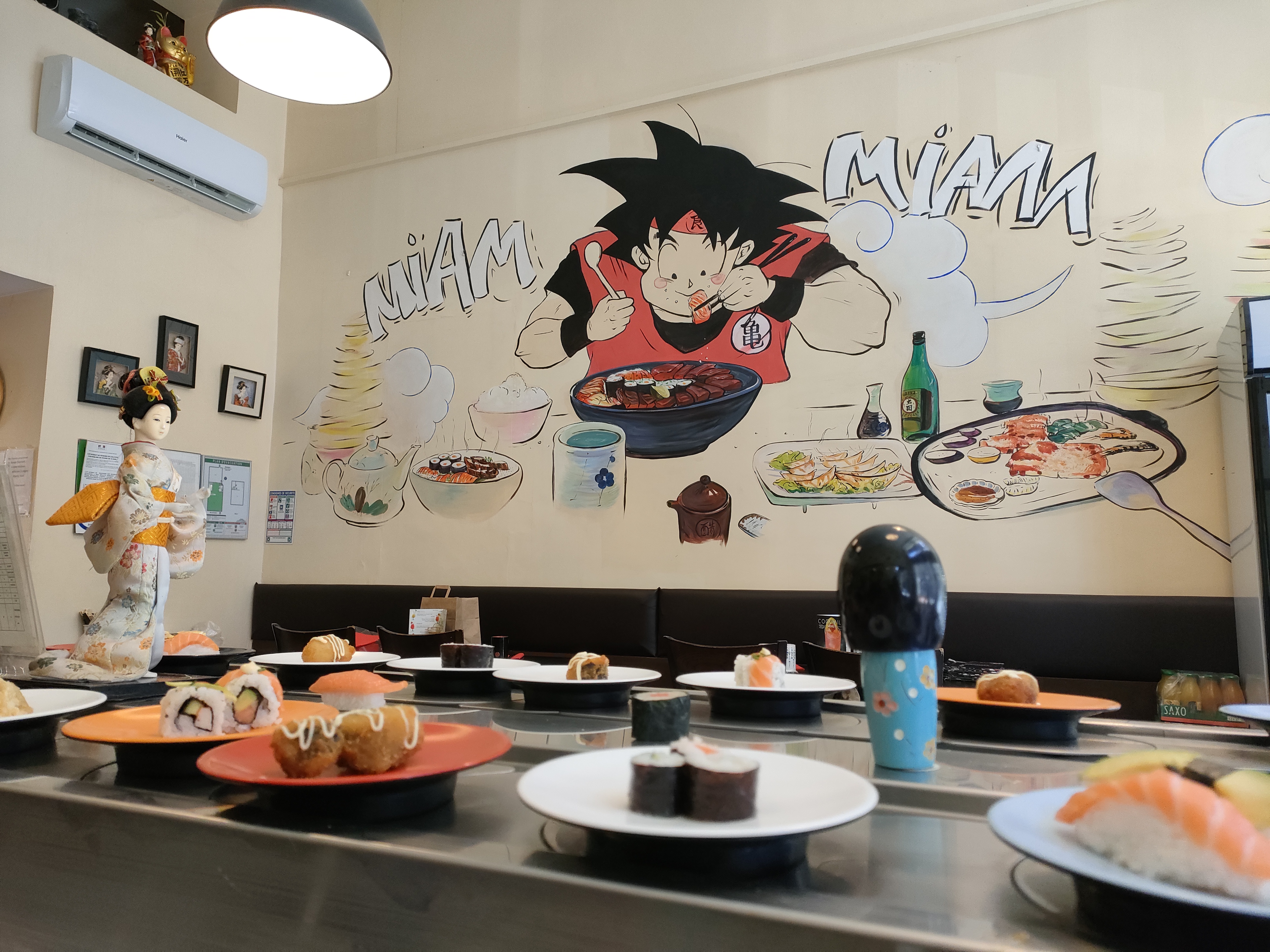 Super buffet à volonté japonais sur plateau tournant. Décoré avec des dessins de Dragon Ball en plus :) Très bon, choix varié, prix raisonnable.
