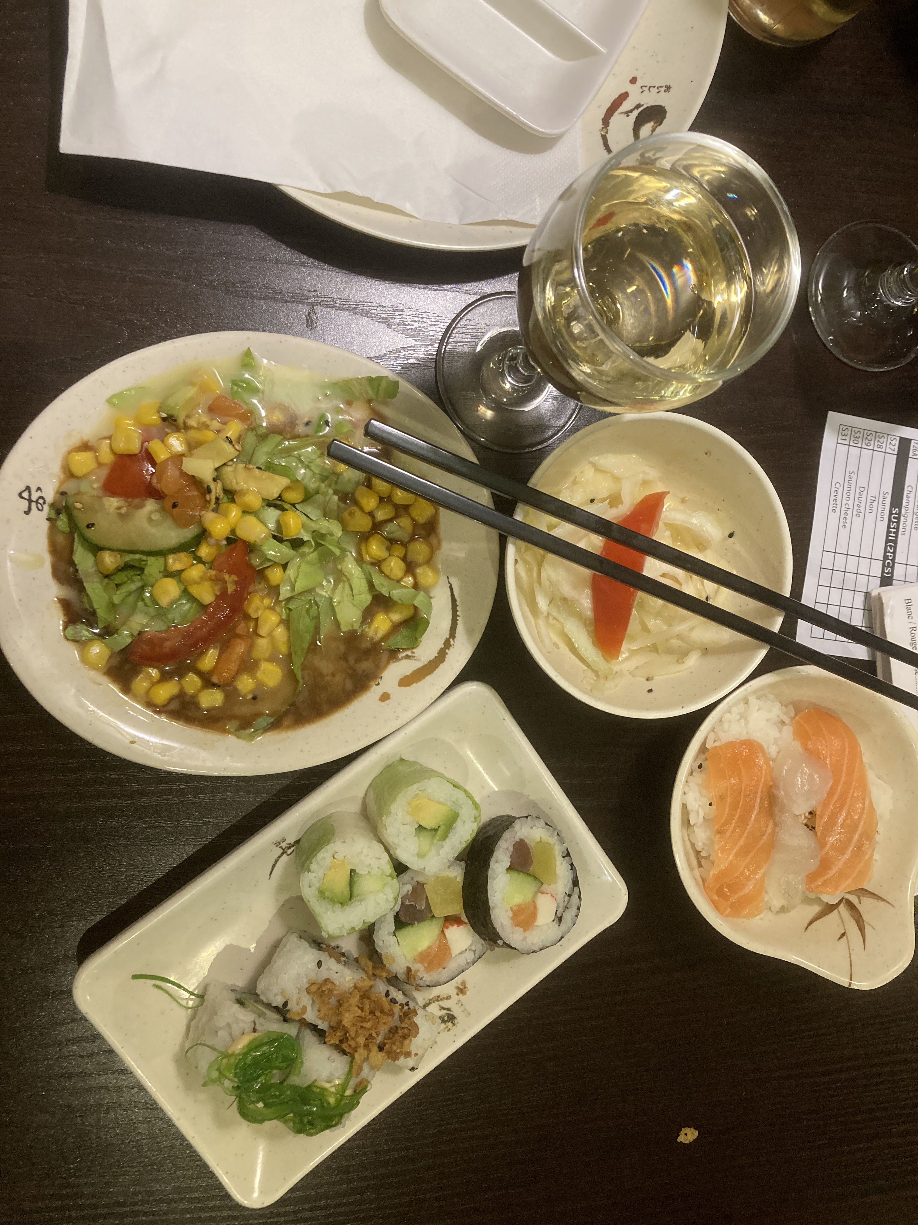 Grands choix de makis et de sushi par contre on regrette que les sachimi ne soient pas proposés le midi. Les portions sont petites. Ils ont cependant tendance a oublier certaines parties de la commande mais le service est rapide et les serveurs aimables.