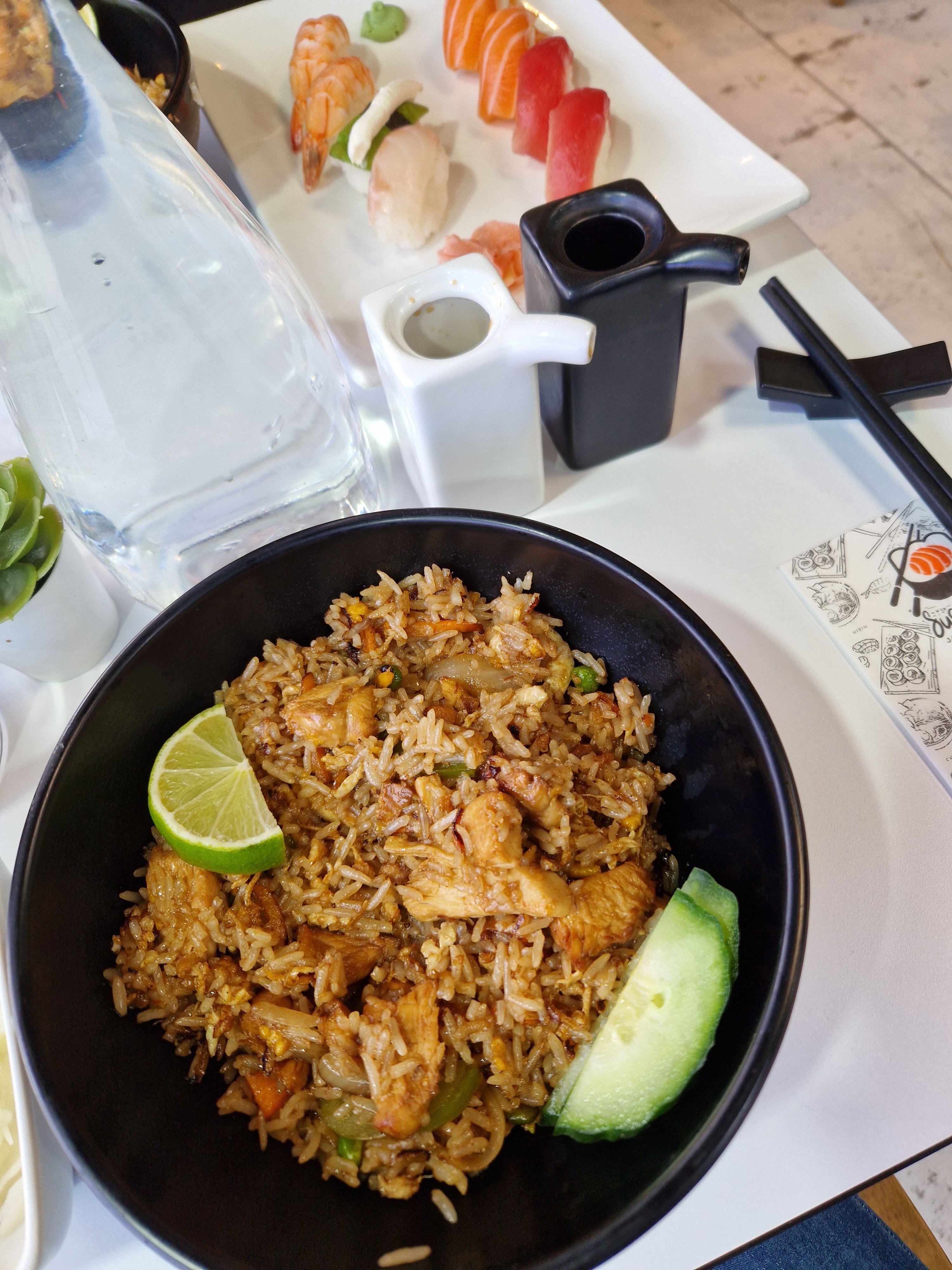 Commande à emporter pour un plateau sushi, les sushis étaient très bons et la sauce soja sucré est excellente. Je recommande. Le prix est abordable 14 euros pour un plateau et 2 entrées. Ca fait plaisir d’avoir des tarifs pas trop cher en vue de l’inflation.