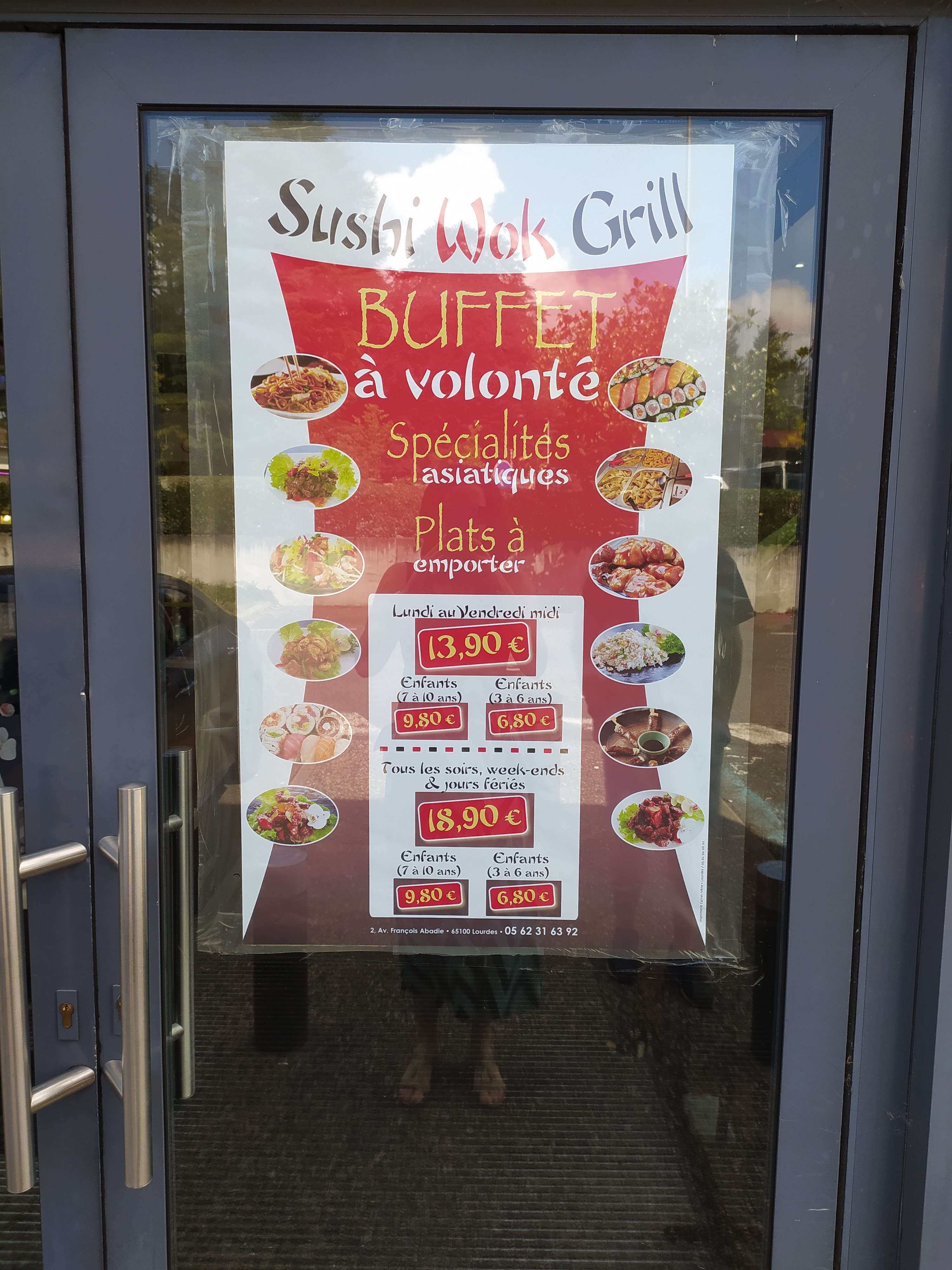 WOK GRILL 🎎 restaurant Asiatique à Lourdes à coté de Feu Vert et Gemo et au fond du parking le magasin Sport 2000 On y à manger plusieurs fois surtout qu 'on aime la cuisine🧧 asiatique 👍🍤🍣 Beaucoup de monde et maintenant le restaurant est fermé 😞 Il y à que à emporter le midi et le soir à cause du Covid aux heures Indiquées sur la photo ci-dessous