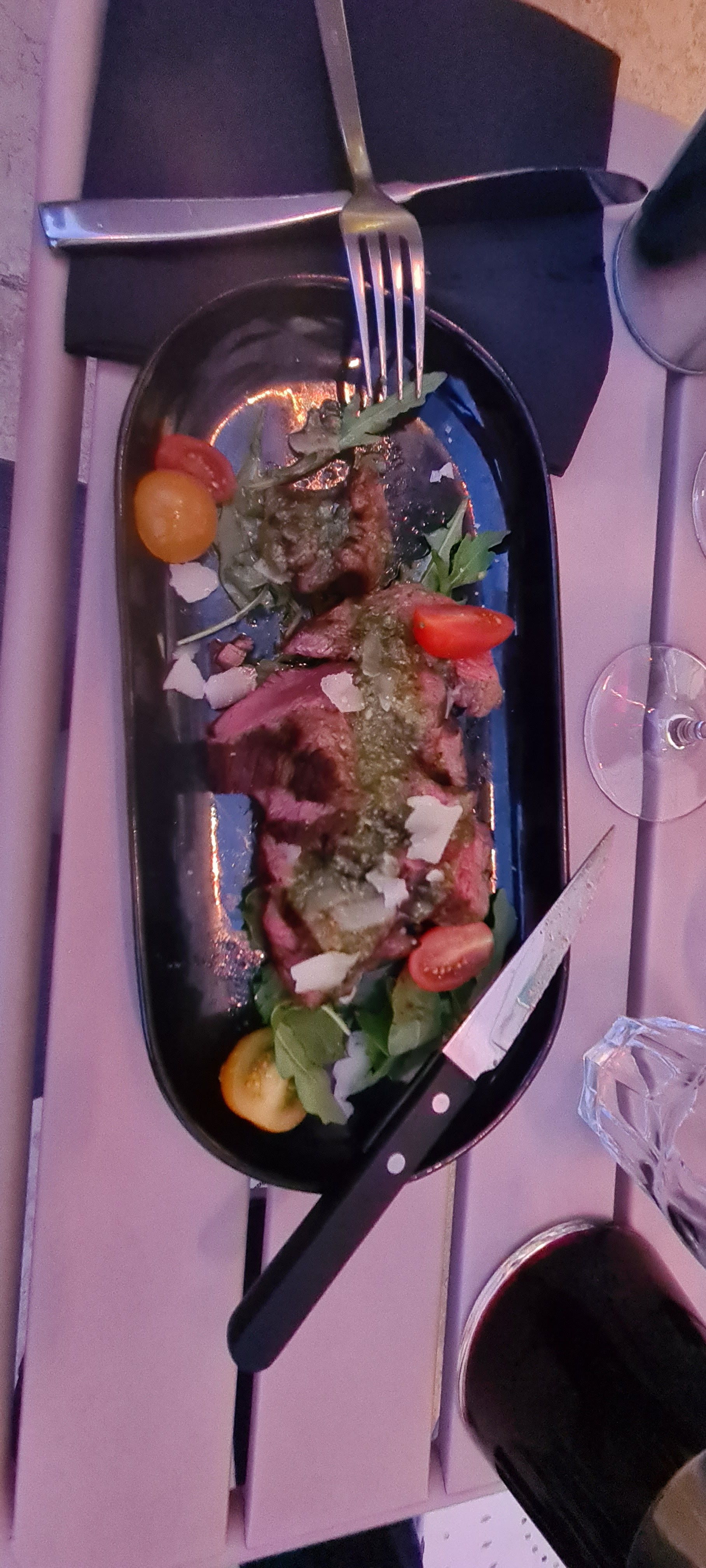 Si ce n’est quelques petites choses à corriger Antipasti, tiramisu : du point de vue de quelqu’un d’exigeant : par exemple, les tomates saveur eau, ou même les olives, n’ont pas vraiment grand chose à faire dans la liste ^^, ça fait même un peu « Je suis là pour justifier le volume servi » Ce qui très dommageable. On aurait aimé retrouver avec les ails confits : tomates séchées, aubergine grillée, ou autres légumes confits/grillés comme les poivrons, artichauts, ou champignons. Si ce n’est des tomates cerises un peu vulgairement coupées en deux, qui donnent une impression franchement mauvaise au regard du prix, et surtout, au vu de leur qualité et du nombre… Dangereux ça, ça casse l’image. Le jambon servi avec était sympa, mais à 17€ l’assiette pour le coup, c’est cher pour ce que c’est. Pour cela je ne peux les recommander. Si cela découle d’une volonté économique pour servir des plats principaux de qualité à prix contenu, dans le cadre de la place, pourquoi pas cela dit. Mais quel dommage ! Quant au tiramisu, trop aérien et aqueux, beaucoup trop. Ce dessert particulièrement doux s’en retrouvait presque amer, acide, dommage aussi ! Peut-être aussi des biscuits trop imbibés. Des antipastis de qualité et un tiramisu plus crémeux, ça aurait été une expérience parfaite.) Ces éléments furent transmis à la personne chargée du service, un mec très ouvert à la critique ! ;) fait rare. C’est cependant une adresse très très correcte ! La tagliata de bœuf, parmesan et pesto de roquette notamment, était excellente. Le service enfin, était particulièrement aimable et à l’écoute. Quant aux prix, étant donné le lieu, ils ne sont pas excessifs. Une adresse recommandable donc ! 🍽 Nous noterons que la petite demande d’une bougie pour fêter symboliquement un anniversaire ce soir là, reçut une petite attention louable. 🕯