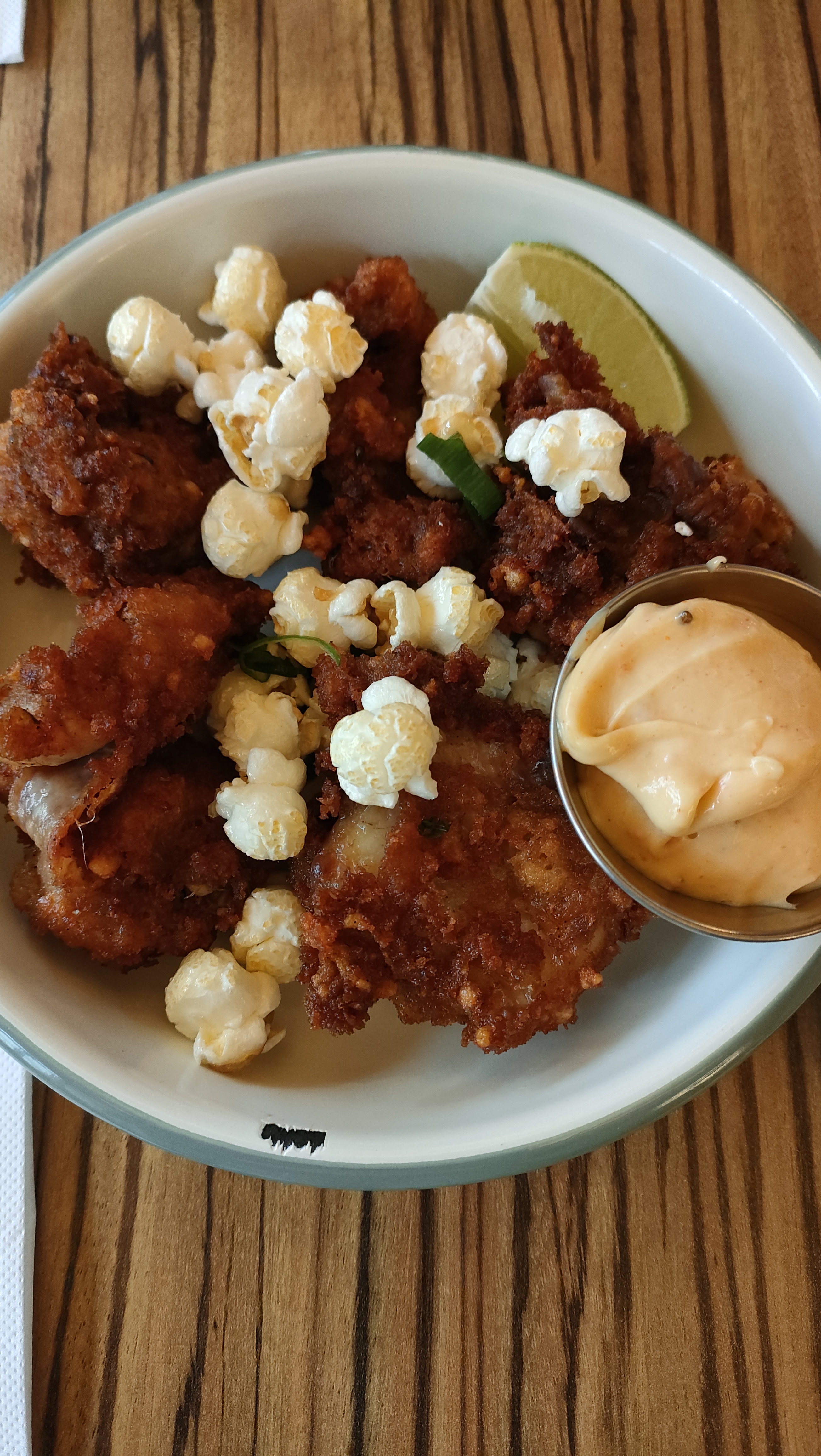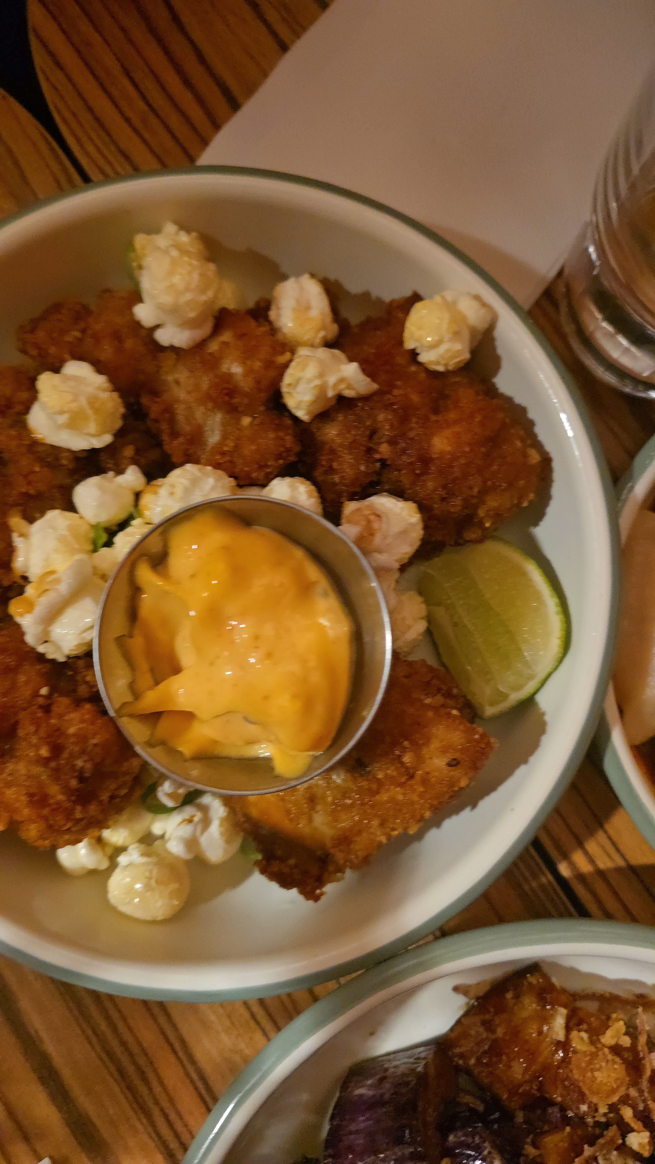 Le poulet est très croustillant et très bonne idée de l'accompagner avec du popcorn sucré, ça donne un goût sucré salé, je recommande. Idem pour les raviolis frit 👌 J'ai commandé aussi les nouilles larges, mais j'ai moins aimé même si ça reste bon. Et le service est bien, ils expliquent bien le concept et les plats dès notre installation et sont très disponibles