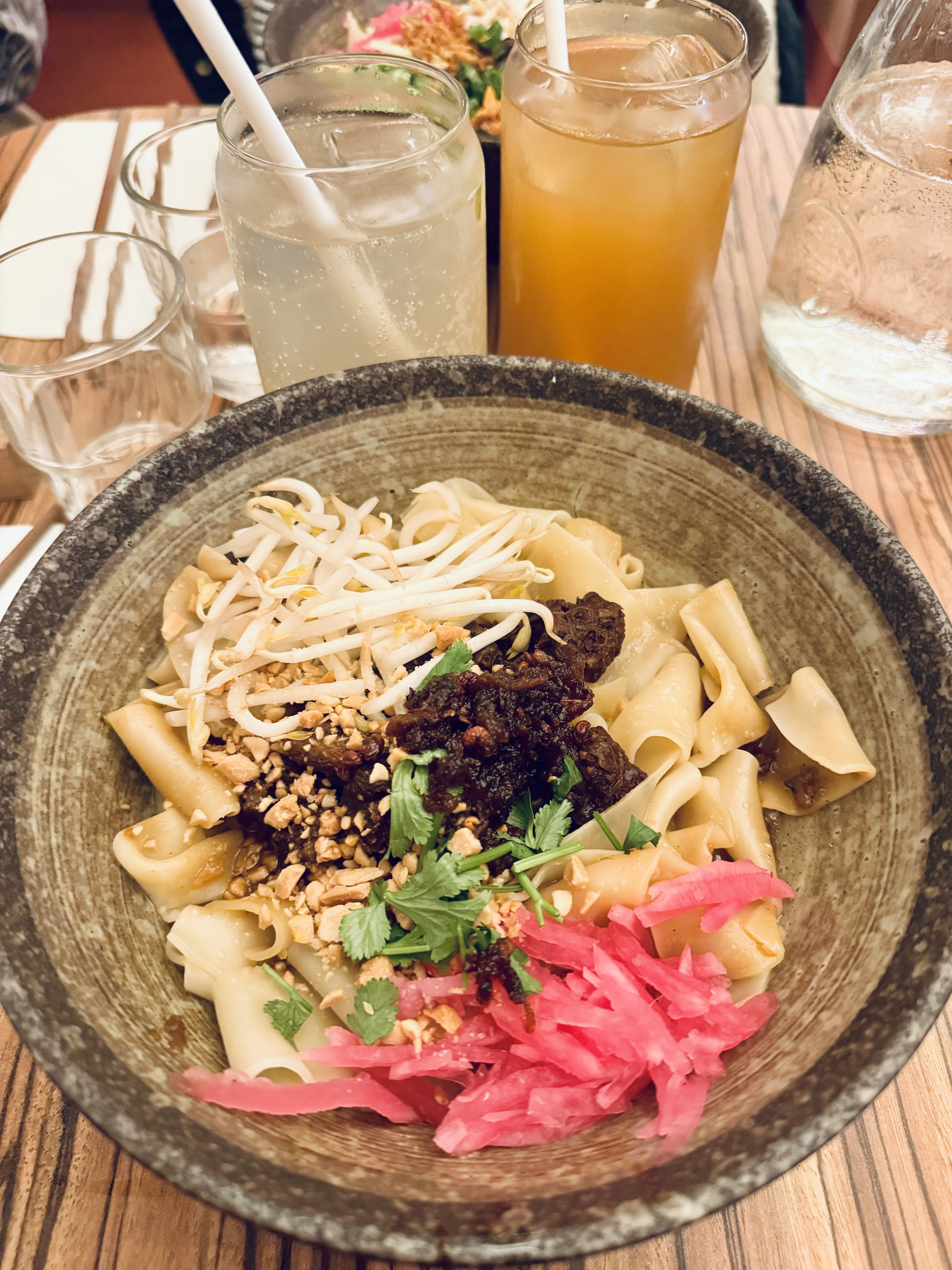La nourriture était rapide, fraîche et délicieuse, et des options vous sont proposées en termes de niveau d'épices. Les nouilles sont larges et plates, ce qui est différent de tout ce que j'ai vu auparavant et qui fonctionne très bien ! Pour les plus sensibles, il y a un peu de chaleur au niveau zéro pour les nouilles (ce que j'ai trouvé une bonne chose, mais chacun son goût). Bière fraîche aussi. L'ambiance et le style à l'intérieur comme à l'extérieur sont incroyables : modernes, colorés (mais coordonnés) avec beaucoup de lumière naturelle. Le personnel était également attentif, sympathique et ne nous a pas donné l'impression de devoir partir rapidement. Fortement recommandé!