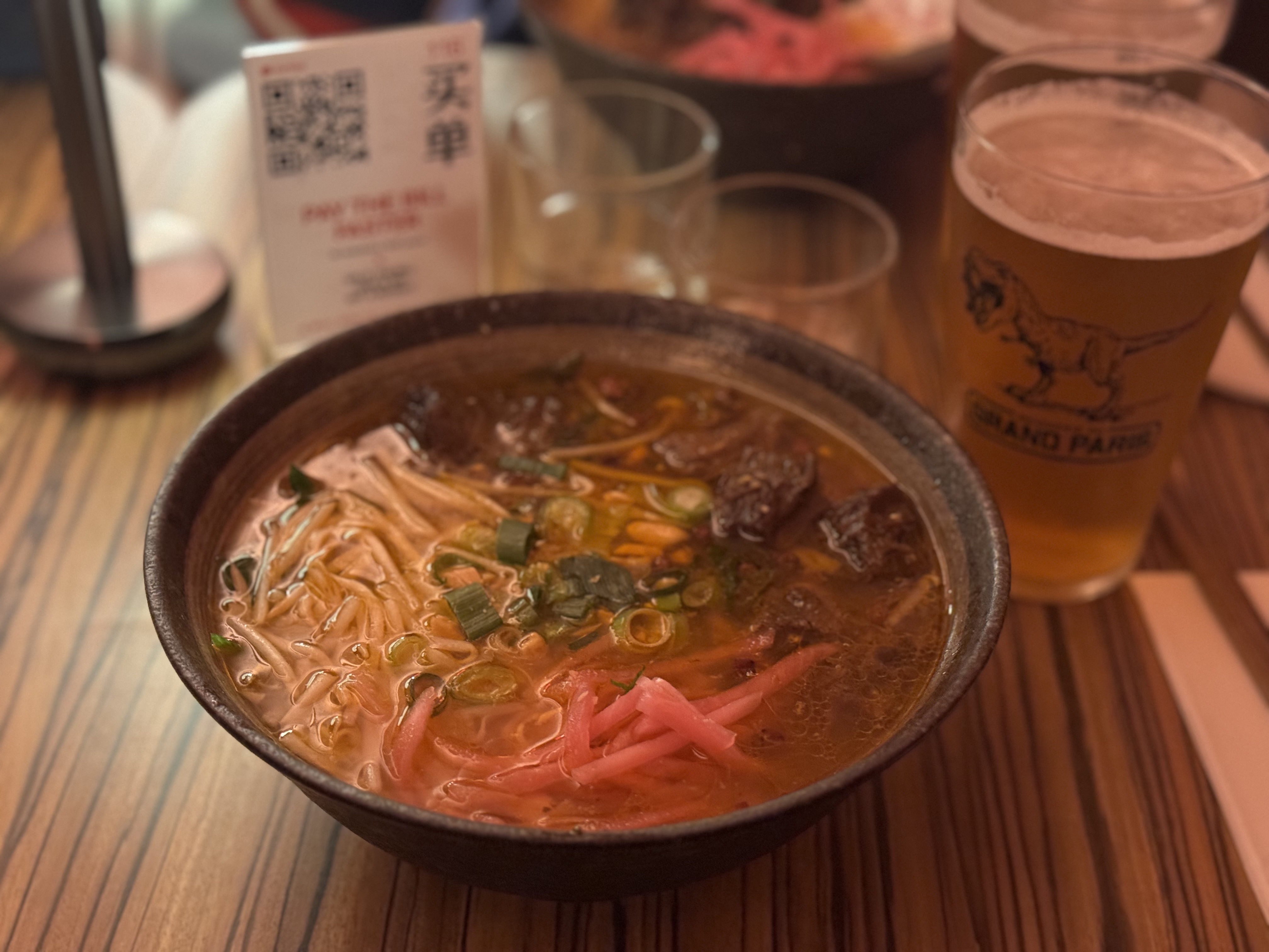 C’était vraiment délicieux ! J’ai adoré les nouilles biangbiang végé bien pimentées 🌶️ le mochi au ganduja c’était délicieux 🤤 Les serveurs étaient très gentils ! Le restaurant juste un peu bruyant.