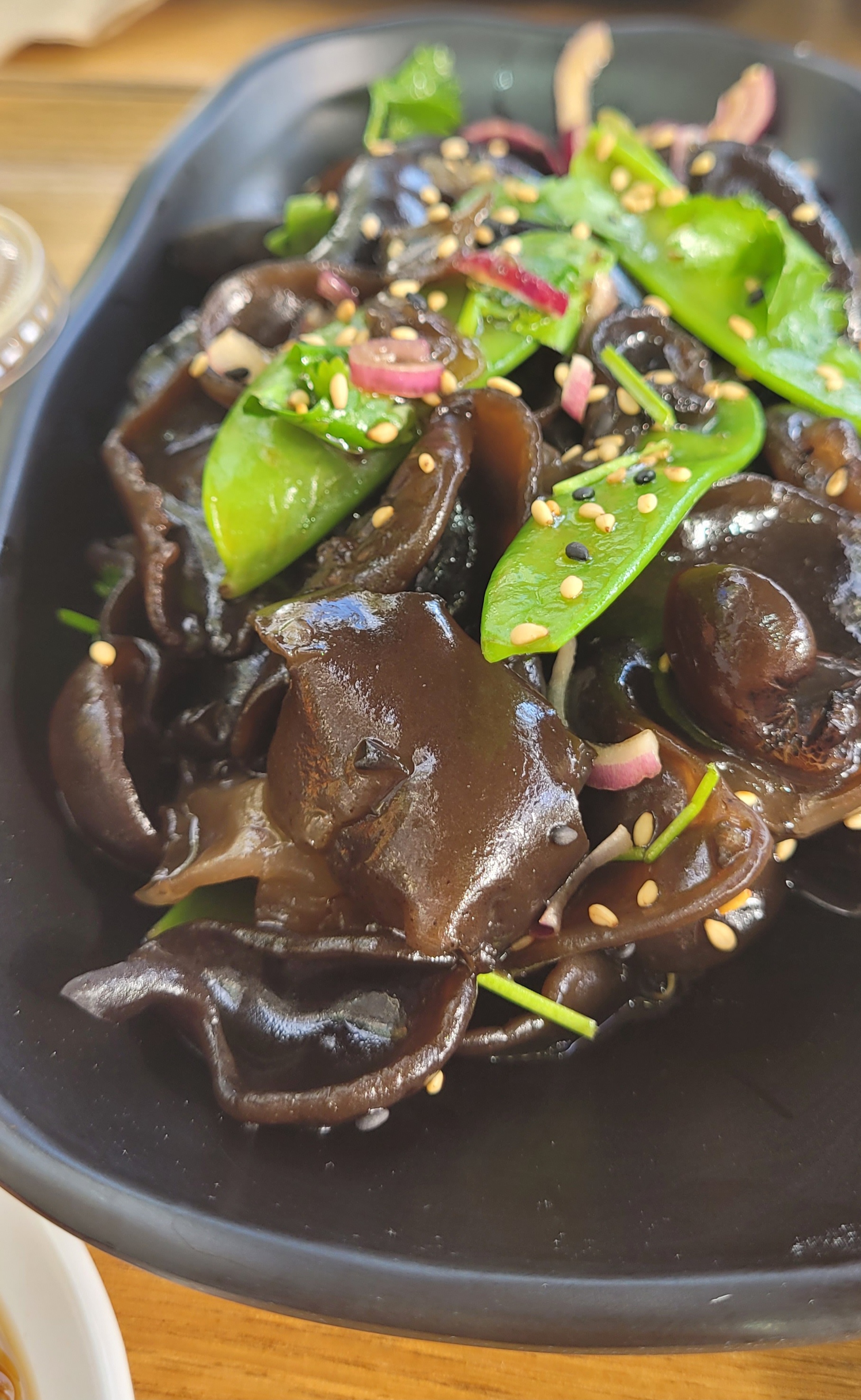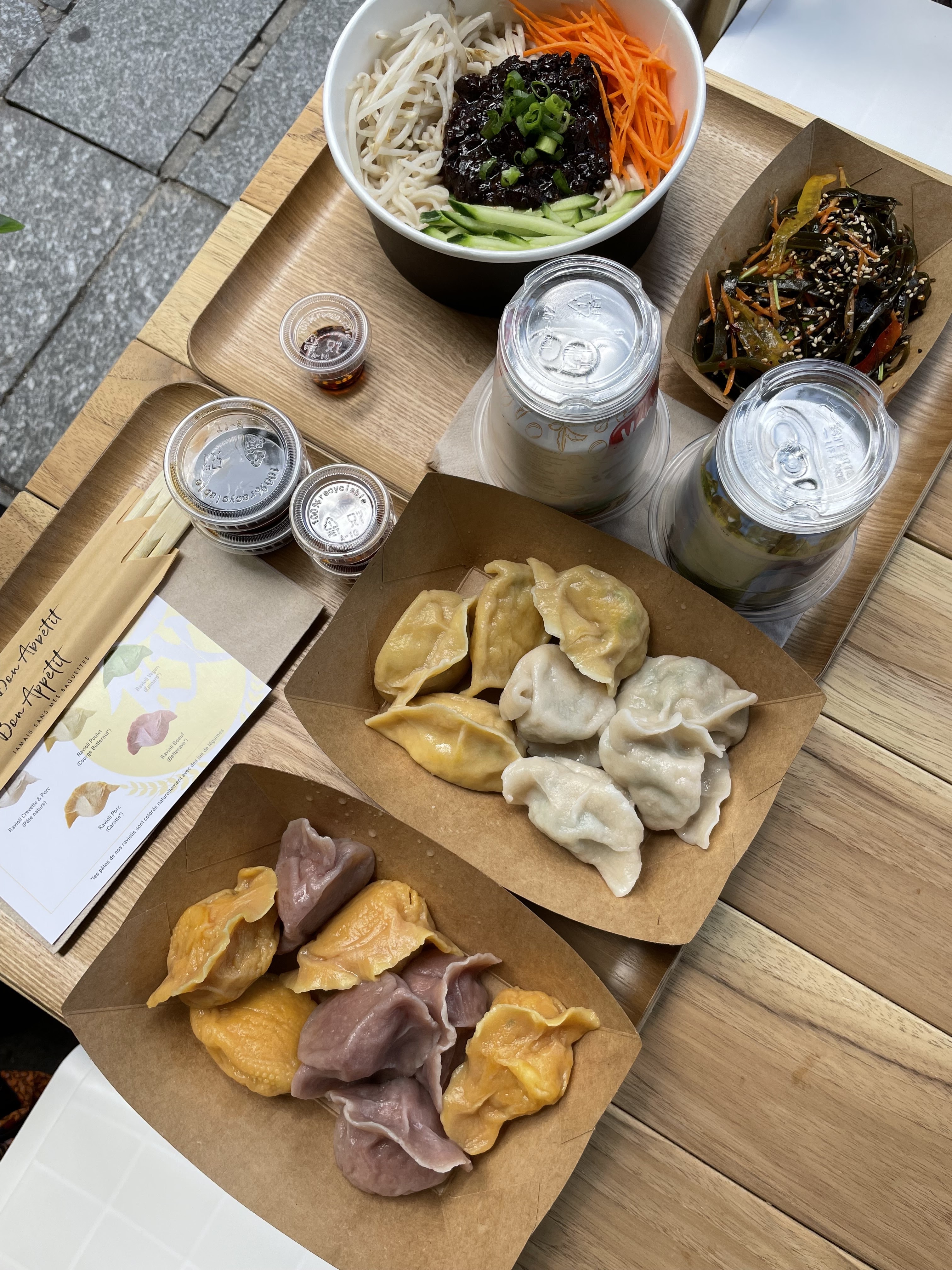 Tenté au hasard en passant par là, je reviendrai : ravioli copieux, frais et goûteux, on distingue bien chaque saveur ; salade champignons noirs et salade algues croquantes et impeccablement assaisonnées 👌