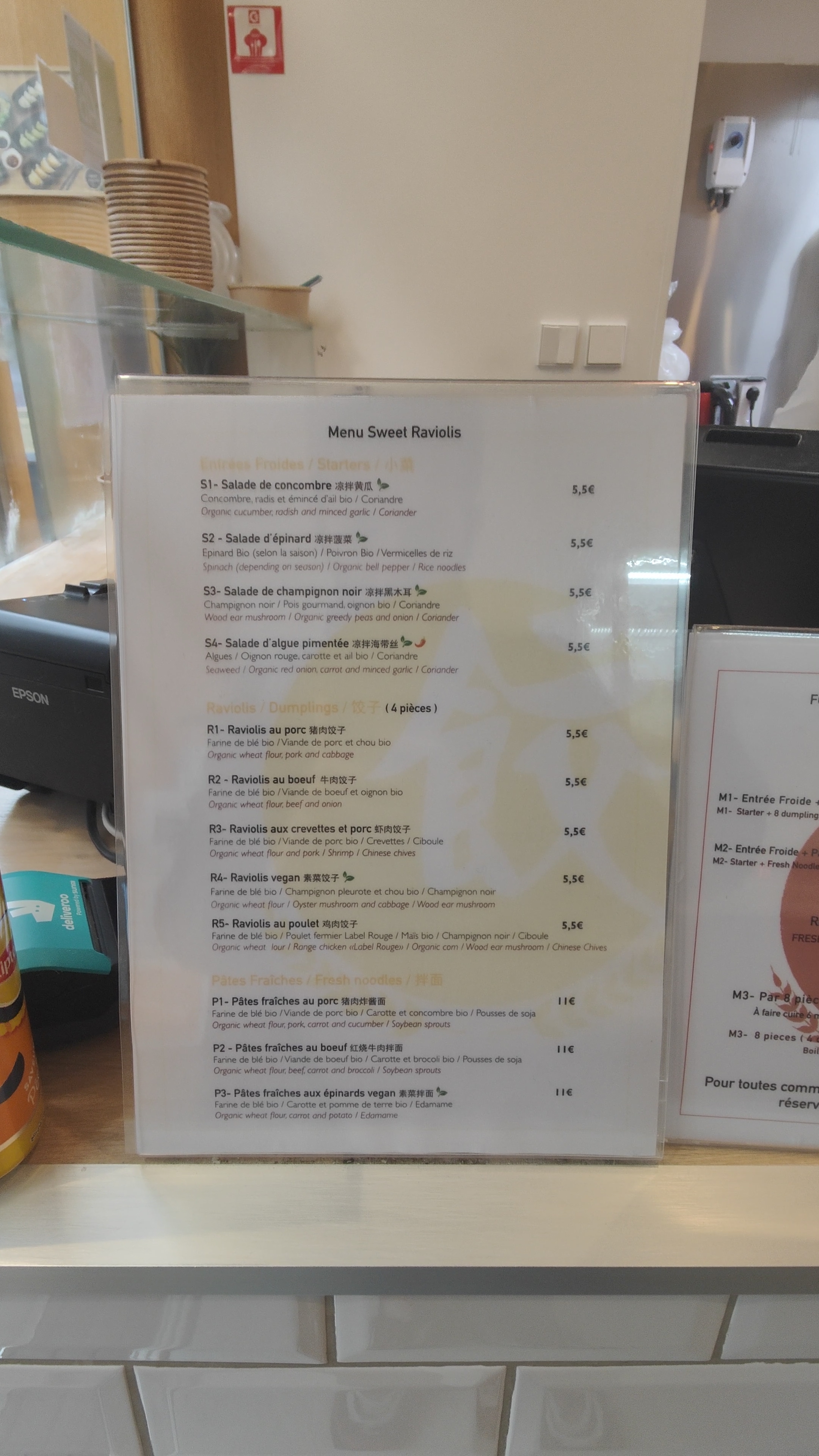 Superbe découverte : raviolis frais faits maison sur le comptoir (y compris la pâte), ingrédients et farine biologiques. Formule à 14€50 : salade d'algue pimentée fraîche et croquante (piment pas trop fort), raviolis végétariens délicieux avec légumes frais et croquants, et raviolis porc-crevette très savoureux. Quantités généreuses. Sauces d'assaisonnement parfaites : sauce soja vinaigrée et sauce piquante au sésame. J'ai aussi essayé les pâtes fraîches végétariennes qui étaient délicieuses et très copieuses ! Accueil souriant et sympathique. J'ai essayé une deuxième fois les raviolis à cuire chez soi : super facile, 6 min à l'eau bouillante, et tout aussi délicieux !