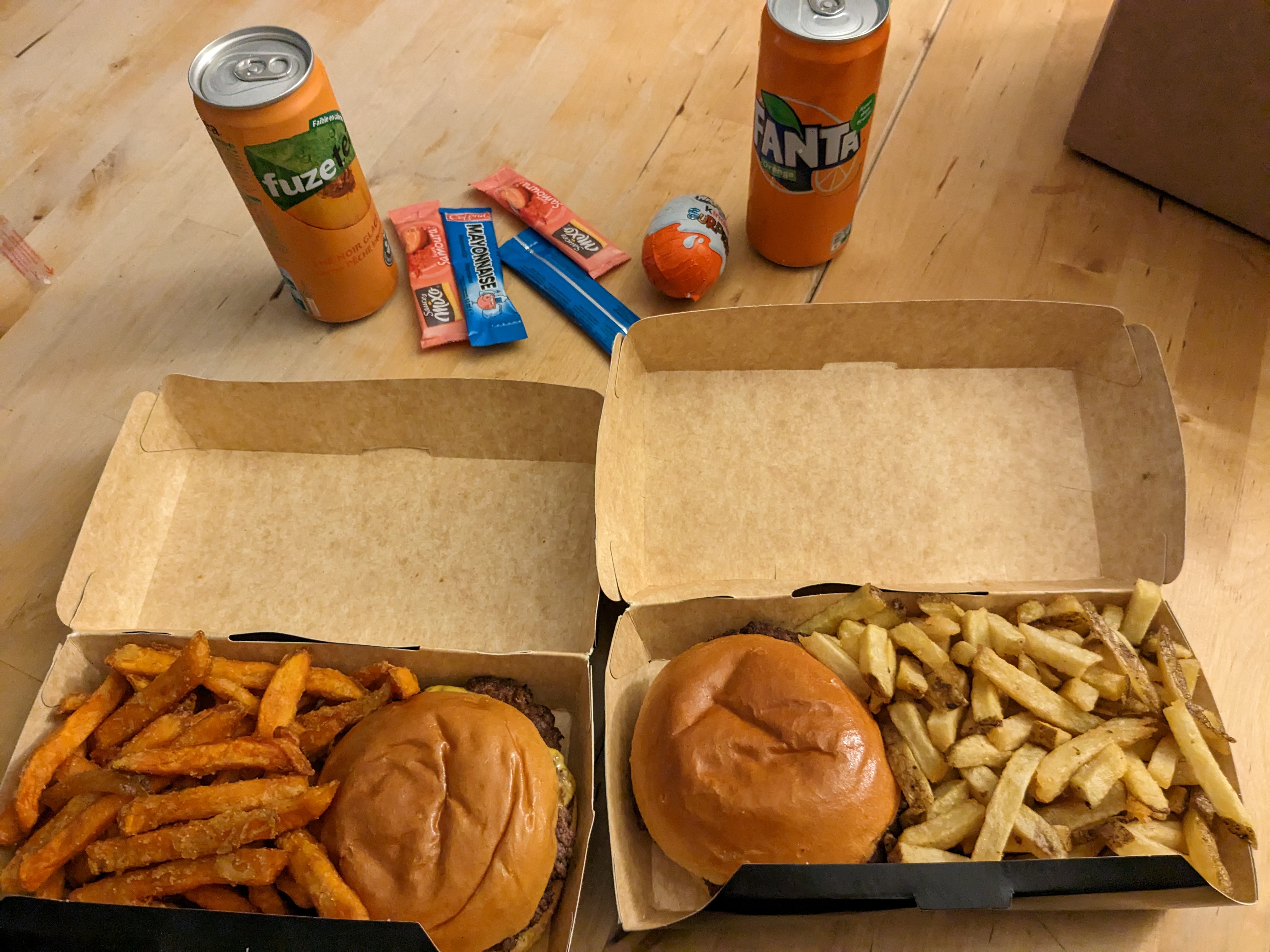 Deux menus Smash burgers délicieux commandés à emporter ! On a pris juste un steak chacun histoire de tester. Steaks un peu fumés, pains briochés et pris avec du Bacon. Portions de frites généreuses (frites ok et patates douces un délice !) Nous avons aussi testé un menu enfant pour notre fille, menu qui a eu du succès (le Capri Sun surtout) et l'oeuf Kinder va en avoir aussi quand on lui donnera. Nous reviendrons avec plaisir.