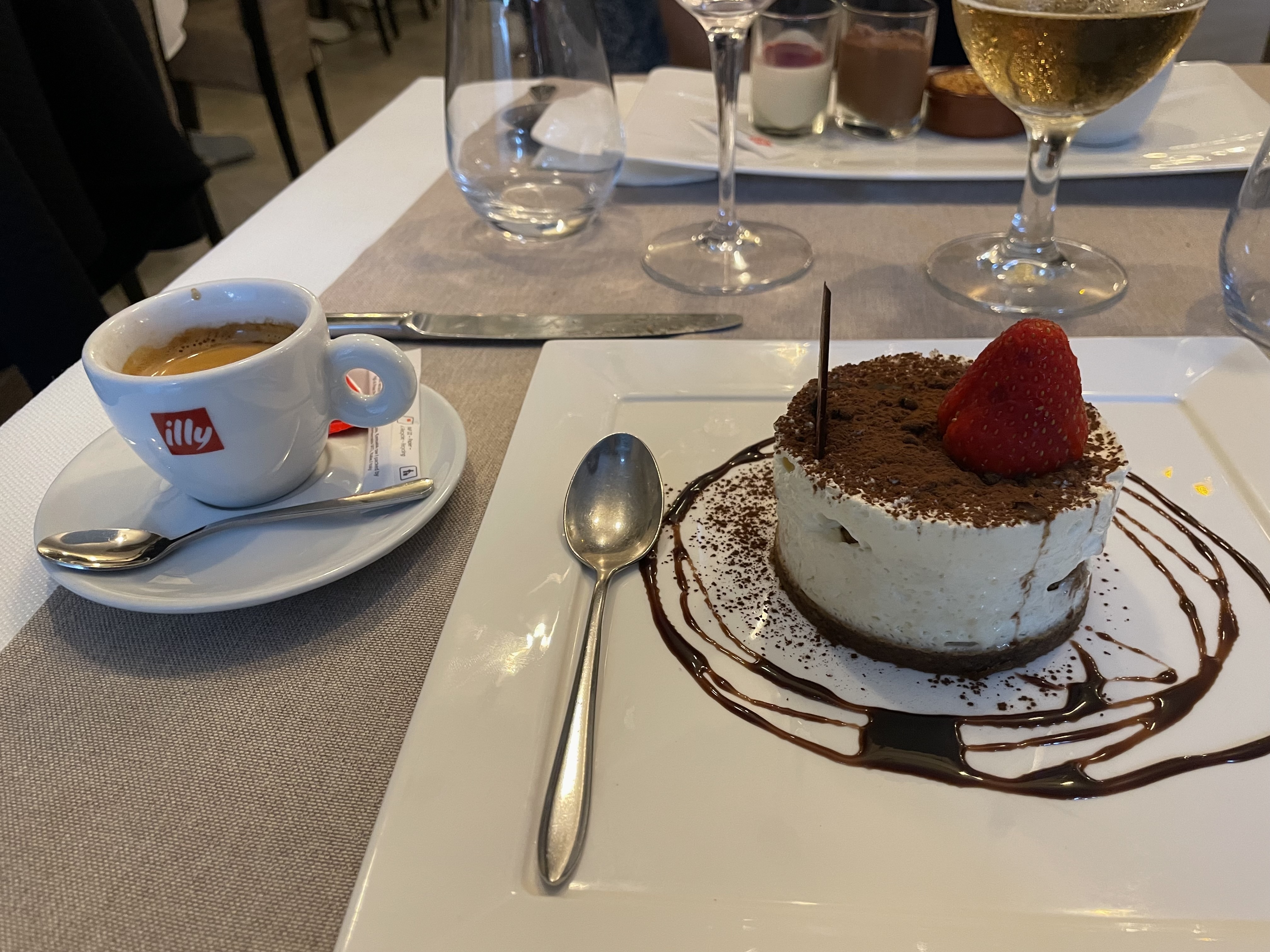 Le restaurant est calme, musique douce, bien insonorisé en plus d'être admirablement décoré. Concernant la nourriture, nous étions 3 et avons dégusté risotto, pizza et calamars, tout était délicieusement préparé, le chianti est super. L'accueil et le service sont également très agréables. Pour les desserts (tiramisu en photo) et le café, c'était également une merveille. Félicitations pour cette superbe adresse on reviendra avec plaisir, aussi pour découvrir la terrasse !