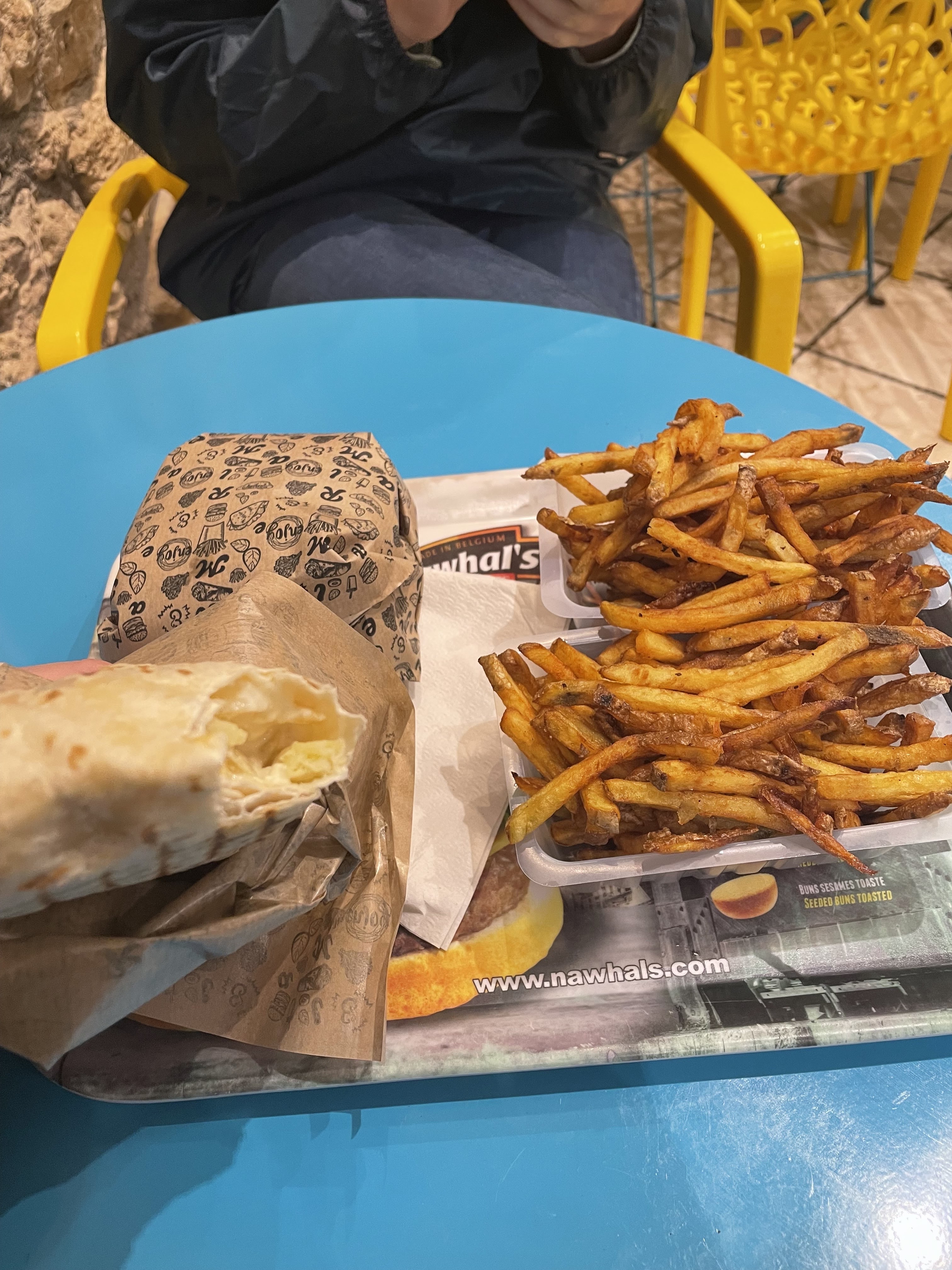 Tacos très savoureux (français, donc ils ressemblent beaucoup à des burritos). Vous pouvez choisir entre petit, moyen et grand, nous avons choisi moyen mais ils étaient en fait trop grands pour nous ! Si petit est certainement suffisant si vous êtes un mangeur moyen. Nous avons trouvé le menu un peu déroutant, alors voici une précision : il y a des frites DANS le taco, mais elles étaient effectivement savoureuses ! Si vous prenez un menu vous recevrez des frites séparément dans un contenant. Vous obtenez gratuitement des sauces pour les frites. C'était très savoureux pour une bouchée rapide et un personnel sympathique.