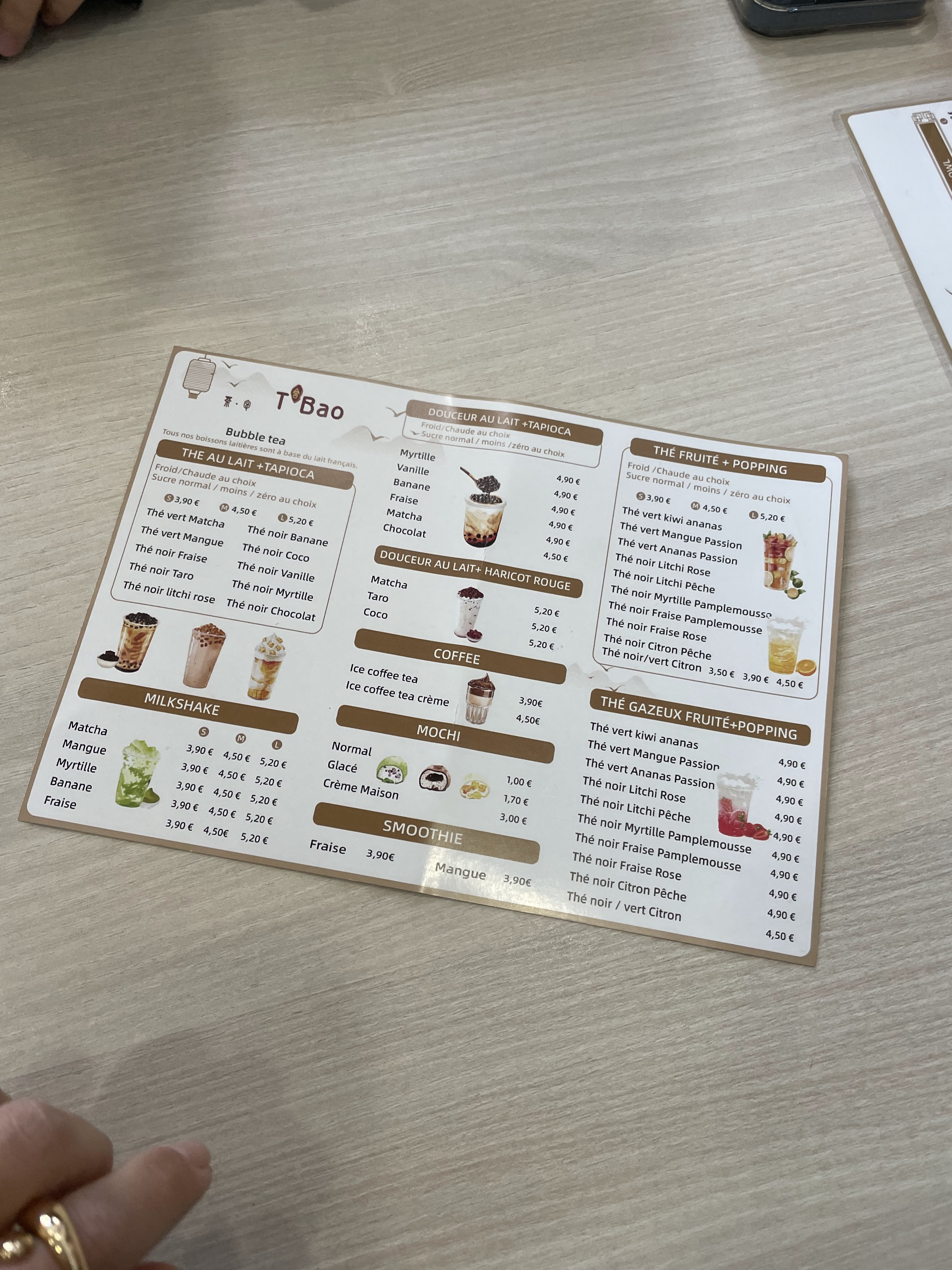 Très bon Boba, le deuxième si ce n'est le meilleur que j'ai bu. Les billes de tapioca sont très bonnes, en plus d'avoir beaucoup d'autres choix. Les prix des plats ont l'air très corrects pour la quantité que j'ai pu apercevoir