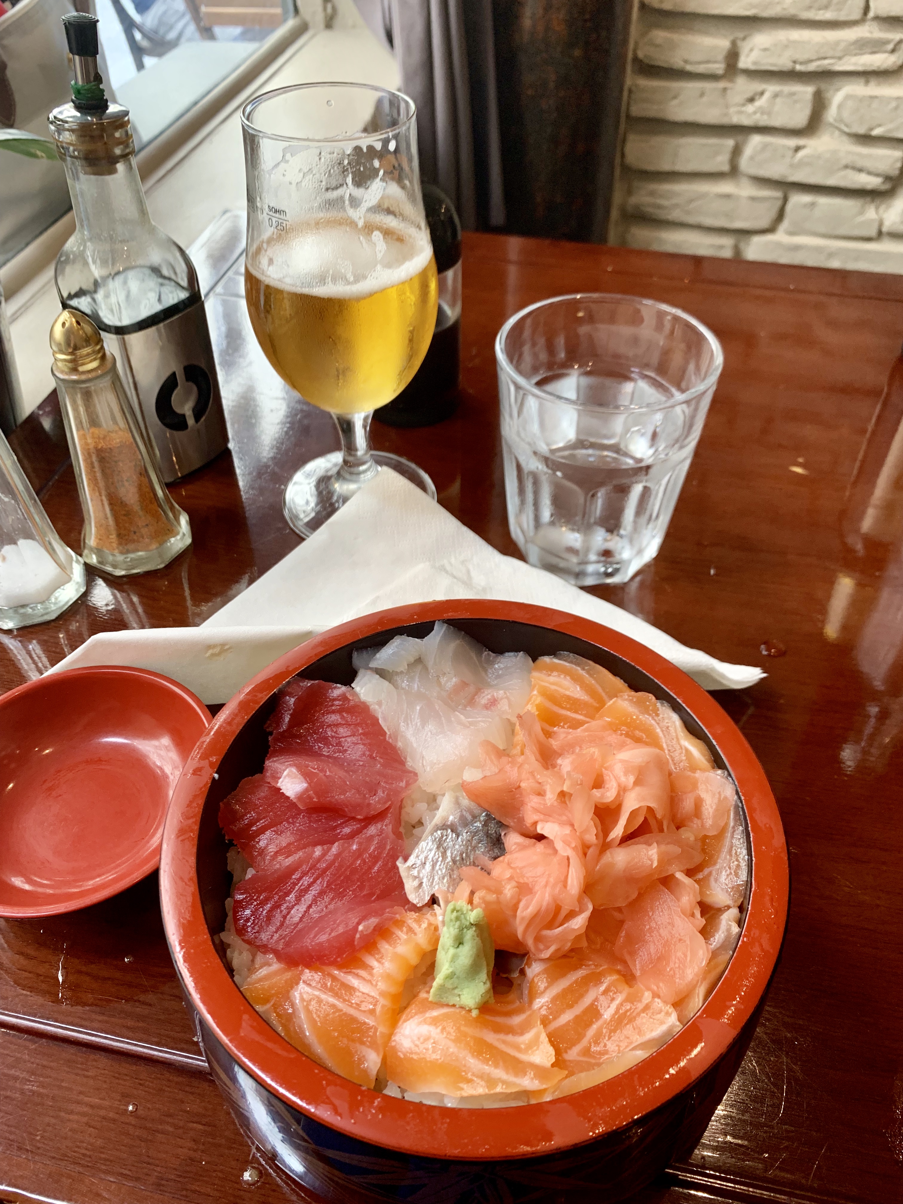 Super sashimi, petits pains frits très bons et croustillants. Peu de table extérieure sans circulation.
