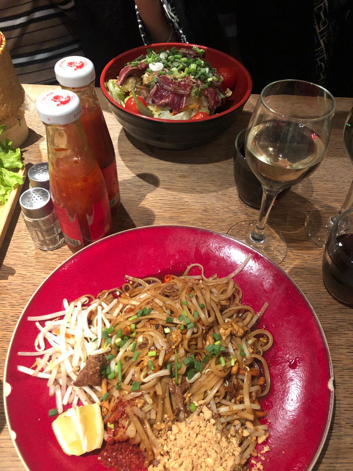 Cuisine de rue thaïlandaise. Cet endroit est incroyable. Il y a beaucoup de monde mais le personnel est très serviable et fait de son mieux pour vous accueillir. Il n'y avait que trois menus en anglais, ce qui était bien. Le serveur a dit qu'ils commandaient plus. J'ai eu le curry rouge avec du riz gluant qui était vraiment sympa. Vous en avez beaucoup et cela coûte 12,90 €. Mon mari a commandé du riz frit au poulet qui était une immense assiette de nourriture et très savoureuse. Cela coûte 11,90 €. Mes deux filles ont commandé une salade de bœuf qui était incroyable et coûtait 10 €. 90 et encore du pad Thai et une très grande portion de nouilles qui coûtait 11 €. Nous avons commandé du vin blanc maison qui était très agréable et confortable à 22 €. Les canettes de Coca pour quatre coûtent 8,80 €. Nous avons également mangé des rouleaux de printemps pour commencer. Ils sont accompagnés de laitue, de feuilles de menthe et de trempettes. Très agréable et ne coûte que 6 €. 90 pour 4. L'endroit était très fréquenté par les gens assis dehors en train de manger. Le roulement a été assez rapide, alors faites caca s’il est occupé. Tu l'adoreras!