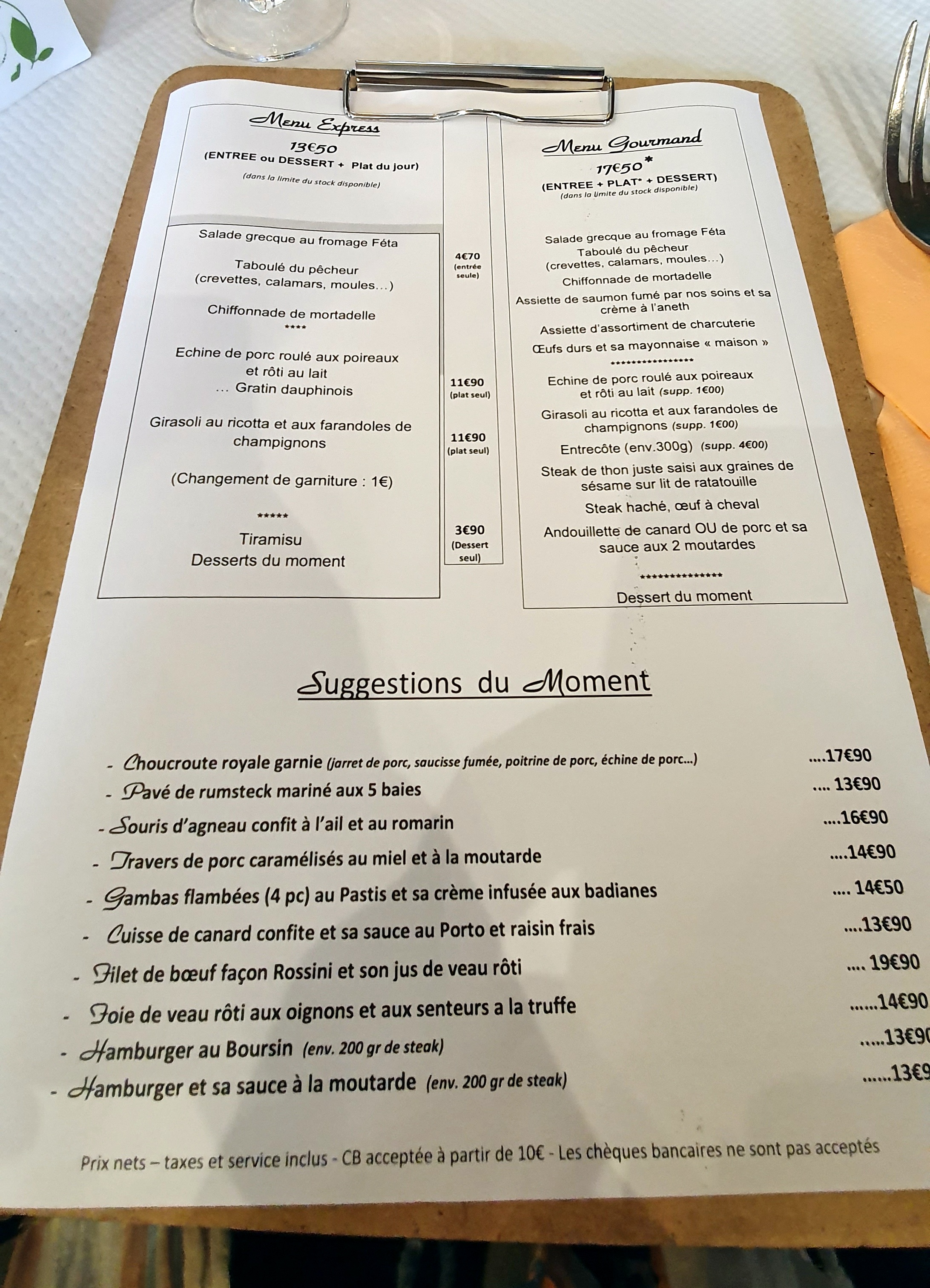 Bon plats,personnel très sympa Menu du jour à prix très correct Petit bémol dès que l on prend un dessert ou fromage en plus ,la note monte très vite