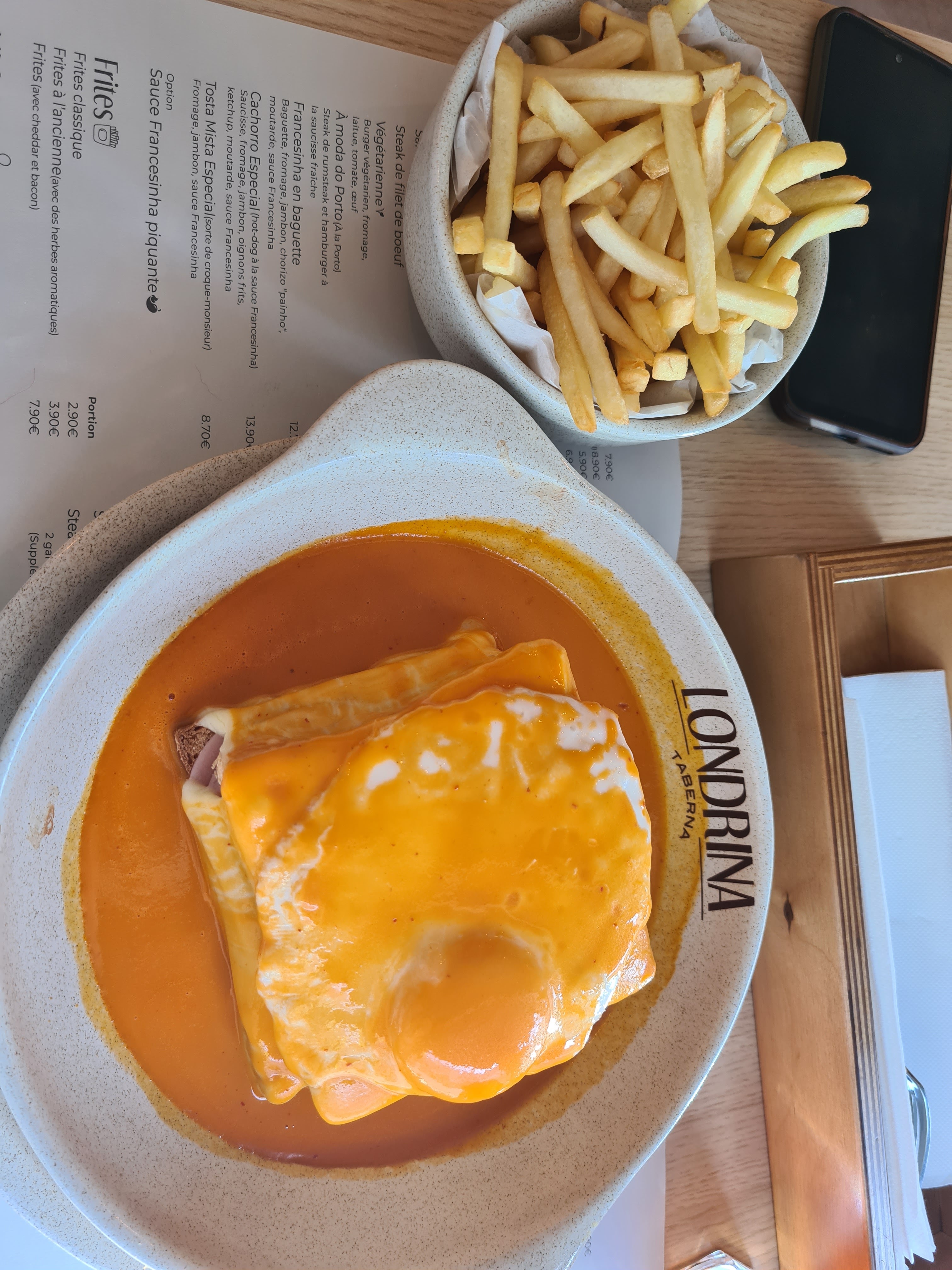 La Francesinha était plutôt bonne. Nous qui sommes de gros mangeurs, on en aurait bien pris deux 😂 mais alors l'addition devient sacrément salée 🤭 Sinon, cadre sympathique. Personnel aussi. Il faudra quand même, à terme, penser à proposer plus pour le prix. Frites à volonté, sauce piquante non payante... Par contre, la bonne surprise fût l'œuf compris 🥳 Merci pour l'accueil et bon courage pour la suite 🫡