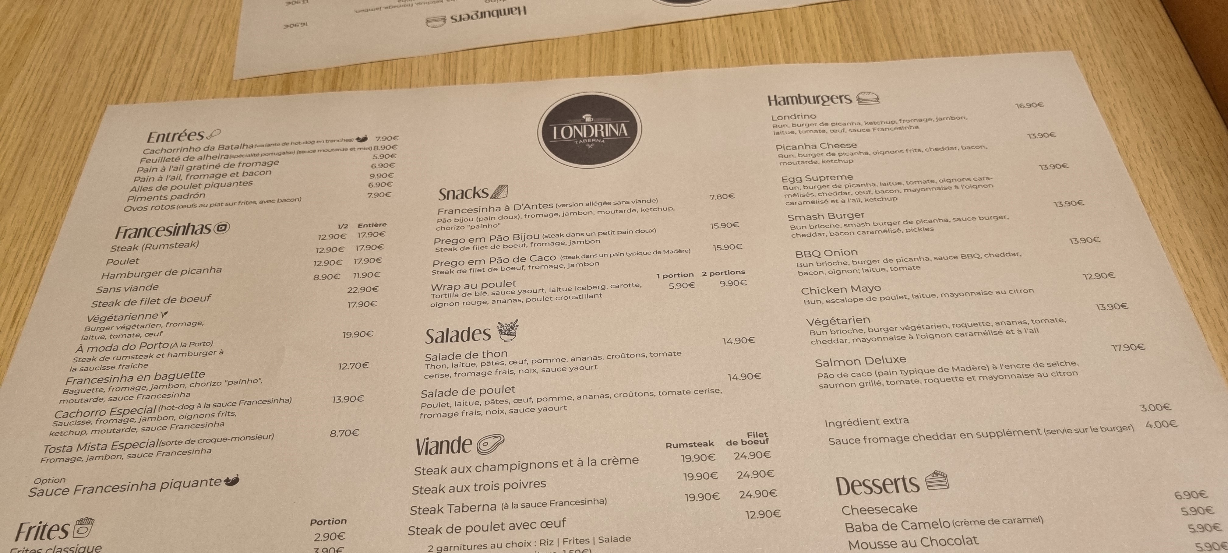Je suis choqué 😮!!!! 31,20€???? Pour une francesinha??????? 6€ pour un coca??? Ou encore 5,30€ pour une super bock sans alcool??????? Mais c’est du vrai n’importe quoi!!!!! Je pense qu’il non pas du tout le sens des affaire n’y des prix c’est pas possible!!! Je suis portugaise et franchement même dans les meilleur restaurant portuguais on ne trouve pas c’est prix là même en livraison!! Franchement vous faite fuir vos client à une vitesse !!!!! C’est pas moi qui vais payer telle prix pour une francesinha les faire à la maison pour pour 4 personne on n’en n’a pour un peut 30€/40€ francesinha maison !!!!