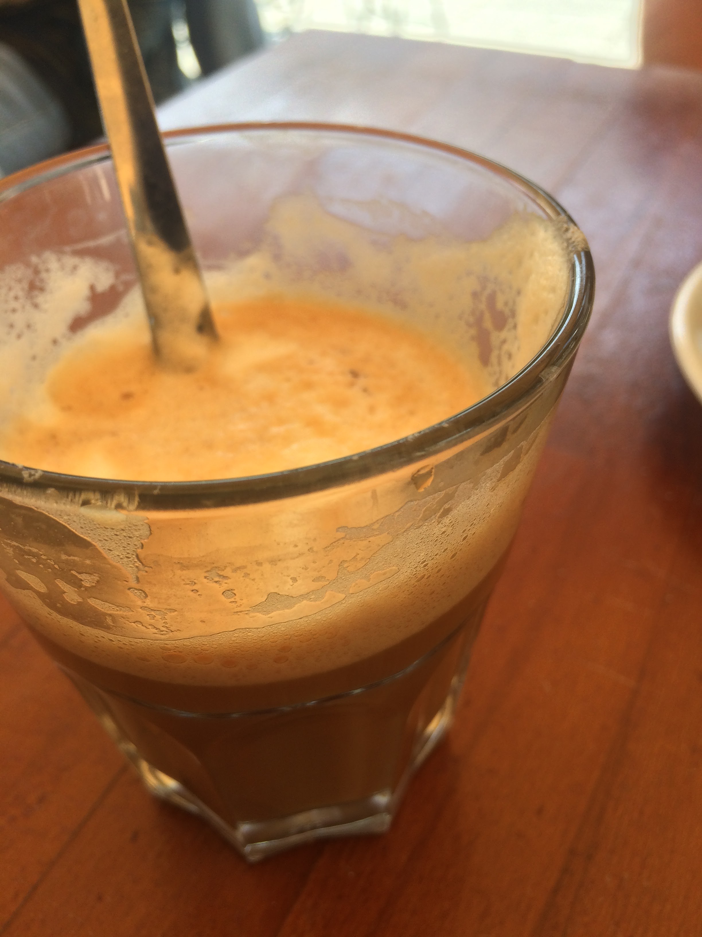 Café Latte au caramel servi dans un verre, le même que notre verre d’eau, pas du tout présentable, de plus c’était imbuvable... le café allongé était tiède... pas bon non plus. Un prix excessif ! Avec des frelons qui rôdaient sur toute les table et à l’intérieur du restaurant... Bref à éviter !