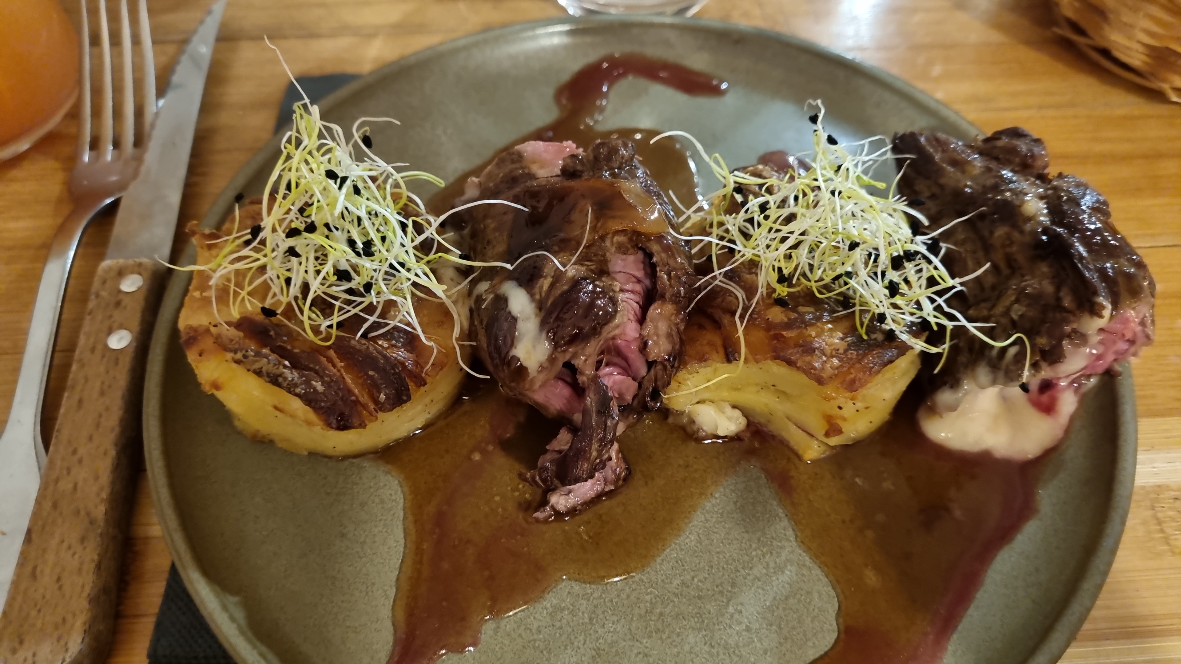 Nous sommes venus un jeudi soir suite à une recommandation. Une petite carte (4 entrées, 4 plats et 4 desserts) mais qui signifie une cuisine maison. L'intérieur est intimiste, cosy. Nous avons pris un apero, servis avec un houmous maison absolument délicieux... en entrée nous avons choisis l'œuf parfait sauce meurette et sa tuile croustillante, c'était divin ! Pour le plat nous avons pris la bavette farcie au jambon cru et comté avec son gratin dauphinois. La viande était très tendre et le plat très savoureux. Plus de place pour le dessert, c'est dommage car la soupe d'agrumes et sa tuile au chocolat me faisait de l'œil... le service était impeccable et le serveur très sympa. Nous avons tout adoré !