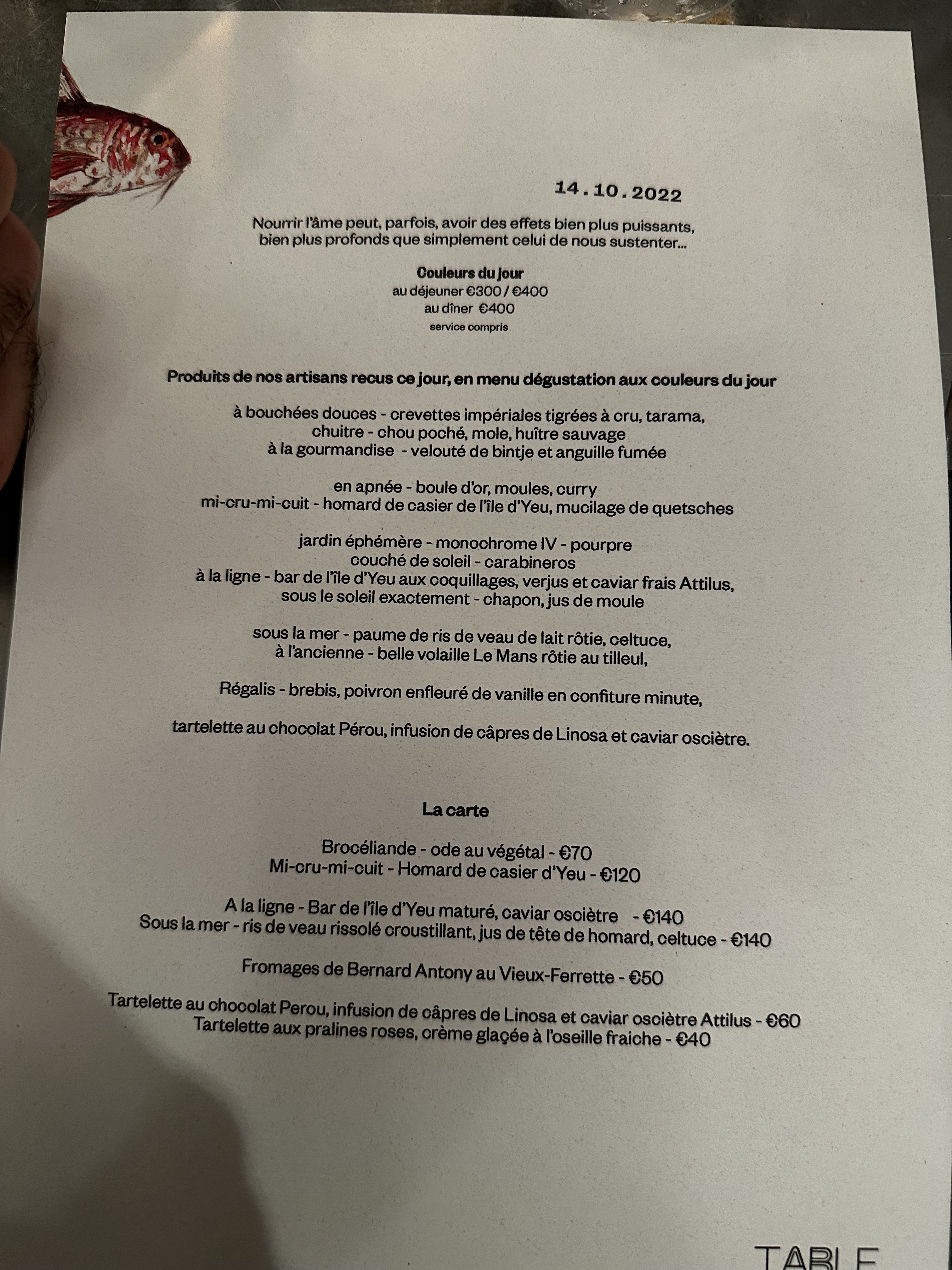 Une parenthèse enchantée en ces premiers jours maussades de septembre. Une atmosphère sobre et agréable pour savourer des plats raffinés aux mille saveurs et généreux, à l'image du chef Bruno Verjus qui était présent en salle. La carte met à l'honneur les producteurs de France et du monde avec des produits de qualité, choisis avec soin par le chef qui transmet sa passion pour ses produits au client aussi bien dans ses présentations des plats au moment du service que dans l'assiette. Mille merci pour ce moment !