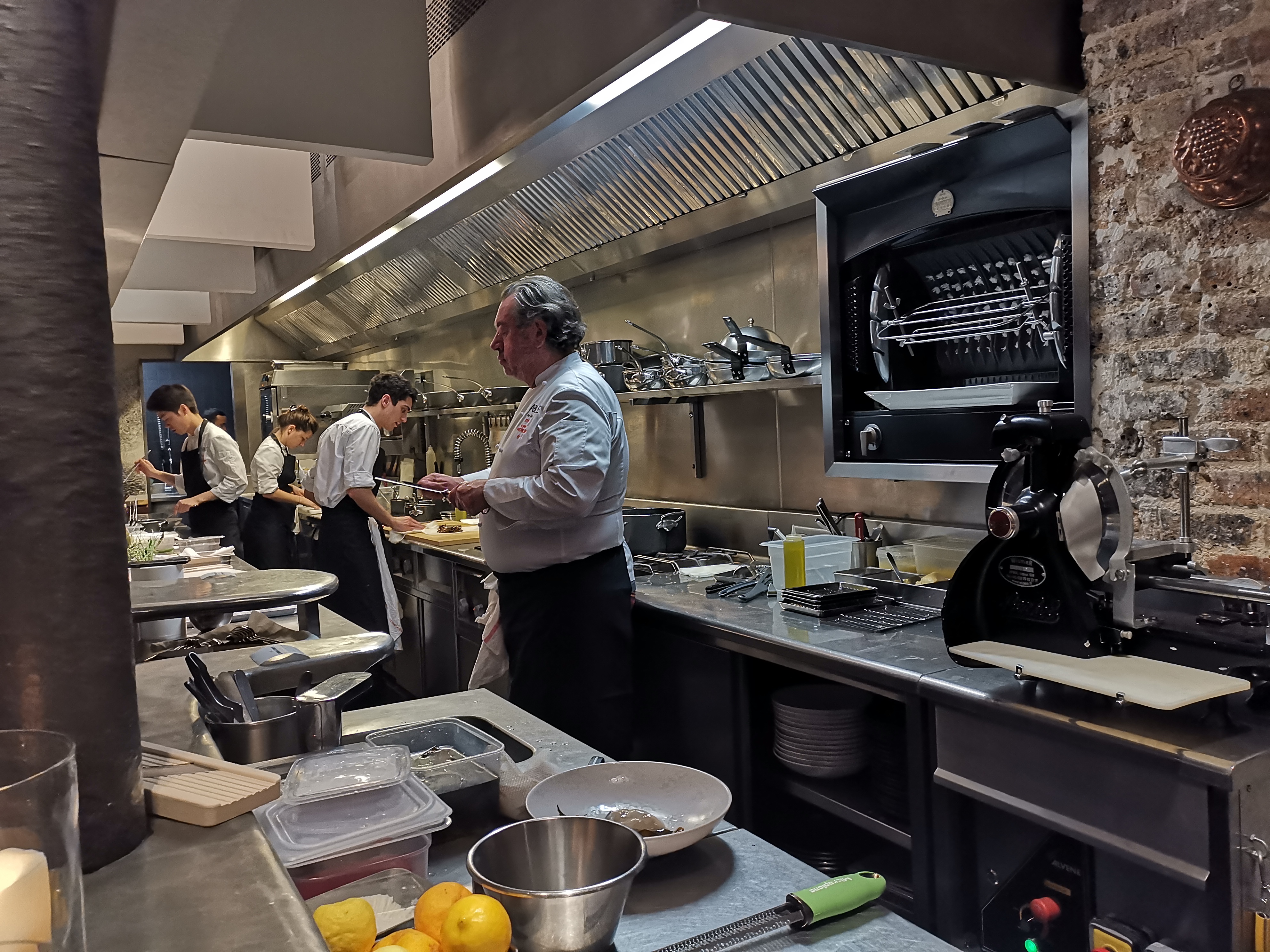Le chef reçoit ses clients comme des amis autour d'une grande table qui enveloppe la cuisine et le spectacle est aussi impressionnant que la qualité et la préparation des produits exceptionnels