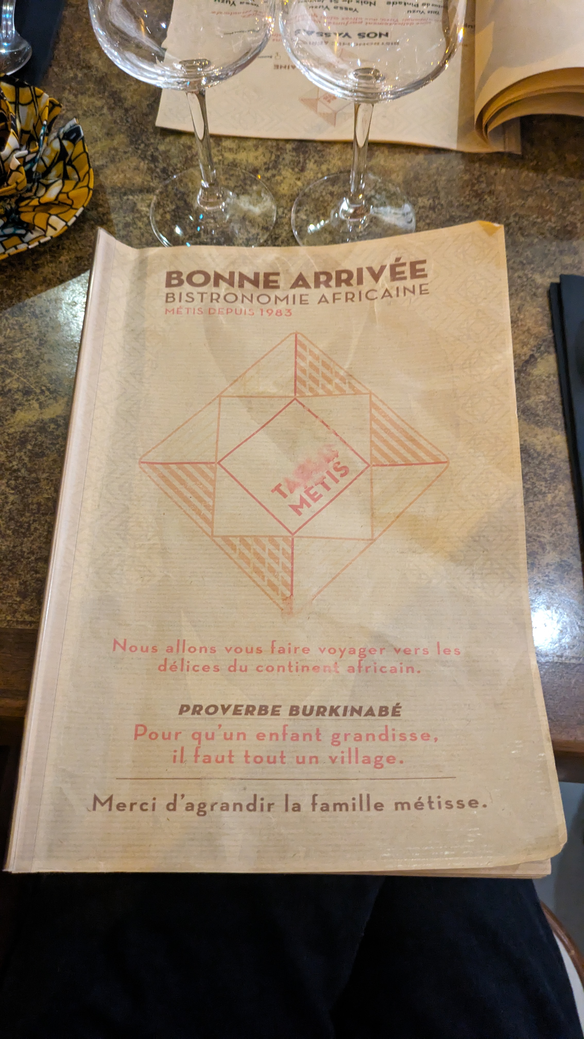 Un établissement qui nous met dans l’ambiance Comme cela l’indique c’est un restaurant qui propose 2 plats typiques d’Afrique qui sont revisites (Yassa et le Mafé). Pour des africains ou des personnes ayant été été en Afrique nous ne sommes pas sur les mêmes saveurs de notre enfance. Mais nous sommes dans des goûts et des associations un peu occidental bistronomique