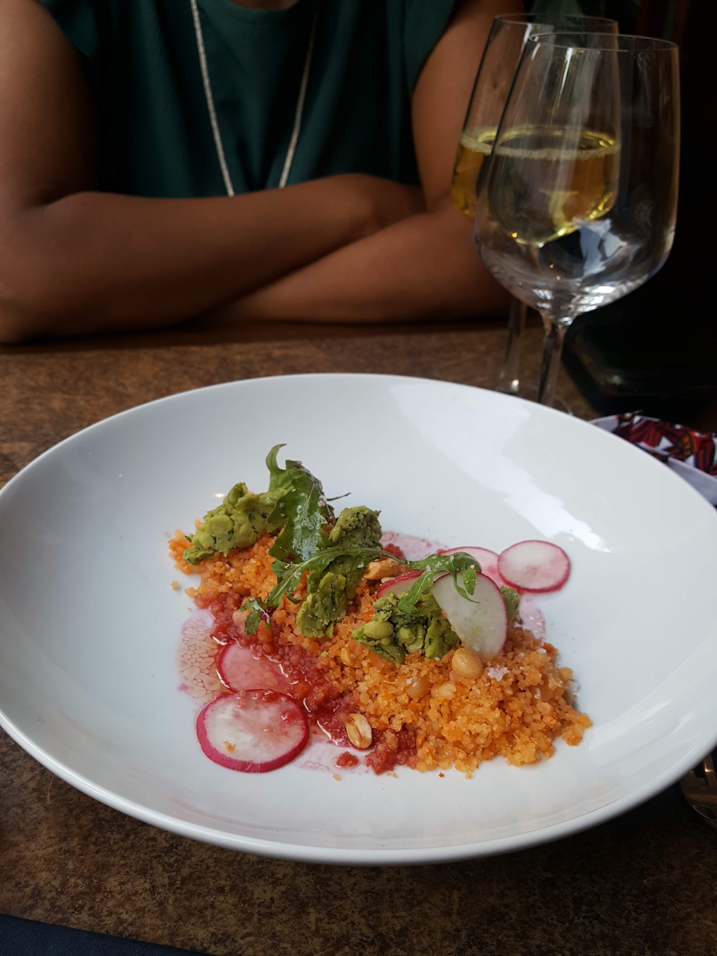 Un chouette concept : des ingrédients africains, des recettes occidentales, le tout revisité par un chef talentueux et ambitieux. Le soir, cela se décline en un menu dégustation en 6 assiettes fusion, omnivores ou vegan, pour un prix raisonnable (33€). Le service est très agréable et sympathique, le cadre tamisé et classe, mais l’attente un peu longue entre les plats ne permet pas de décrocher la 5e étoile. J’y retournerai avec plaisir pour découvrir d’autres créations du chef !