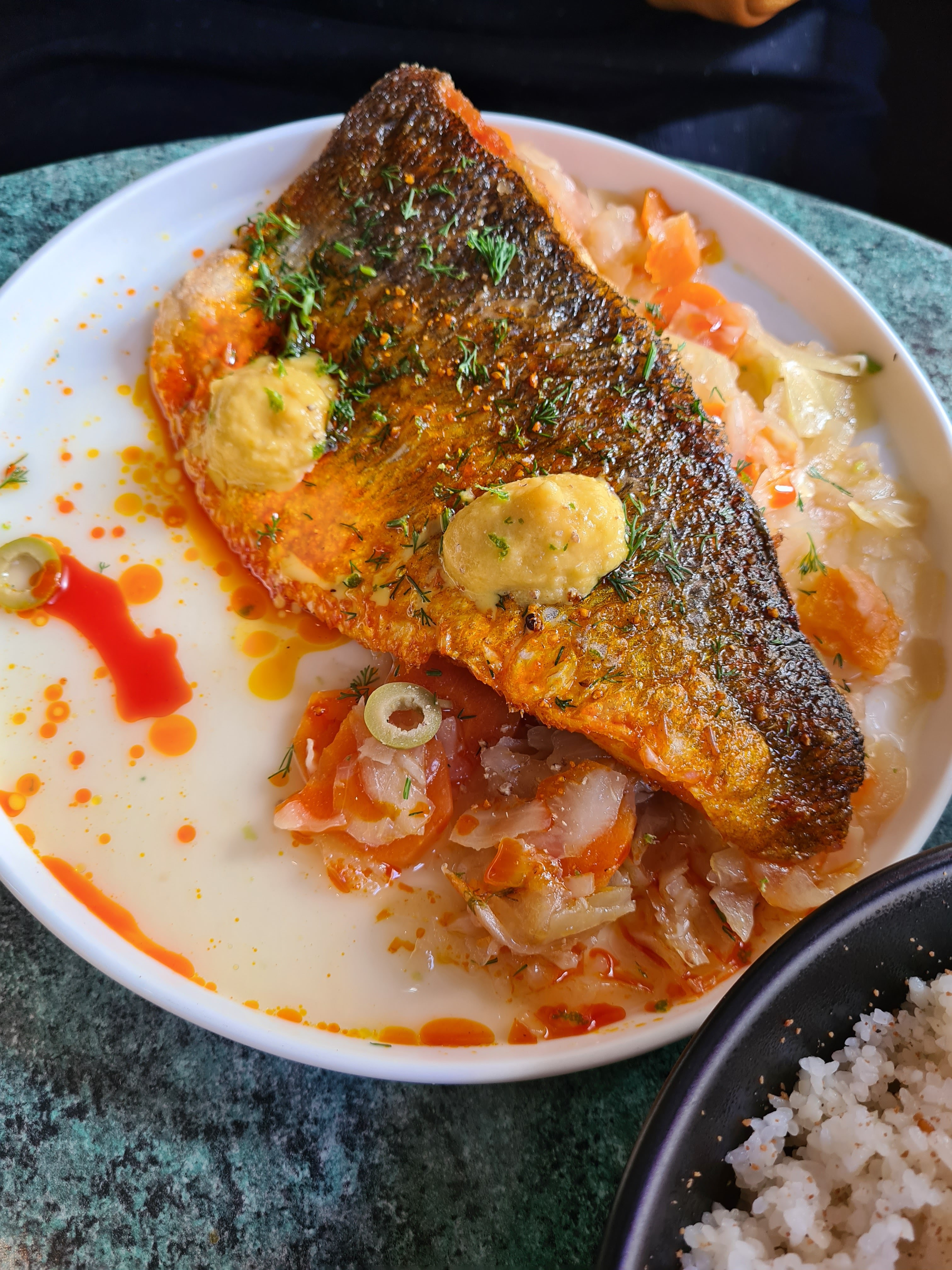 aaaaaaah! c'etait super bon, j'ai manger les trucs vegans (Le mafe super) c'etait wahou. j'ai goûté aussi le yassa coquille st jacques et c'etait un délice. et LES DESSERTS ! un crumble ananas et une pana cotta, trop trop bon. j'y pense encore. les serveur.ses etaient vraiment super mims, je pense être tomber in love de toustes. je reviendrais avec des dates pour crâner tellement il est bon ce resto ! la photo c'est le yassa coquille st jacques.