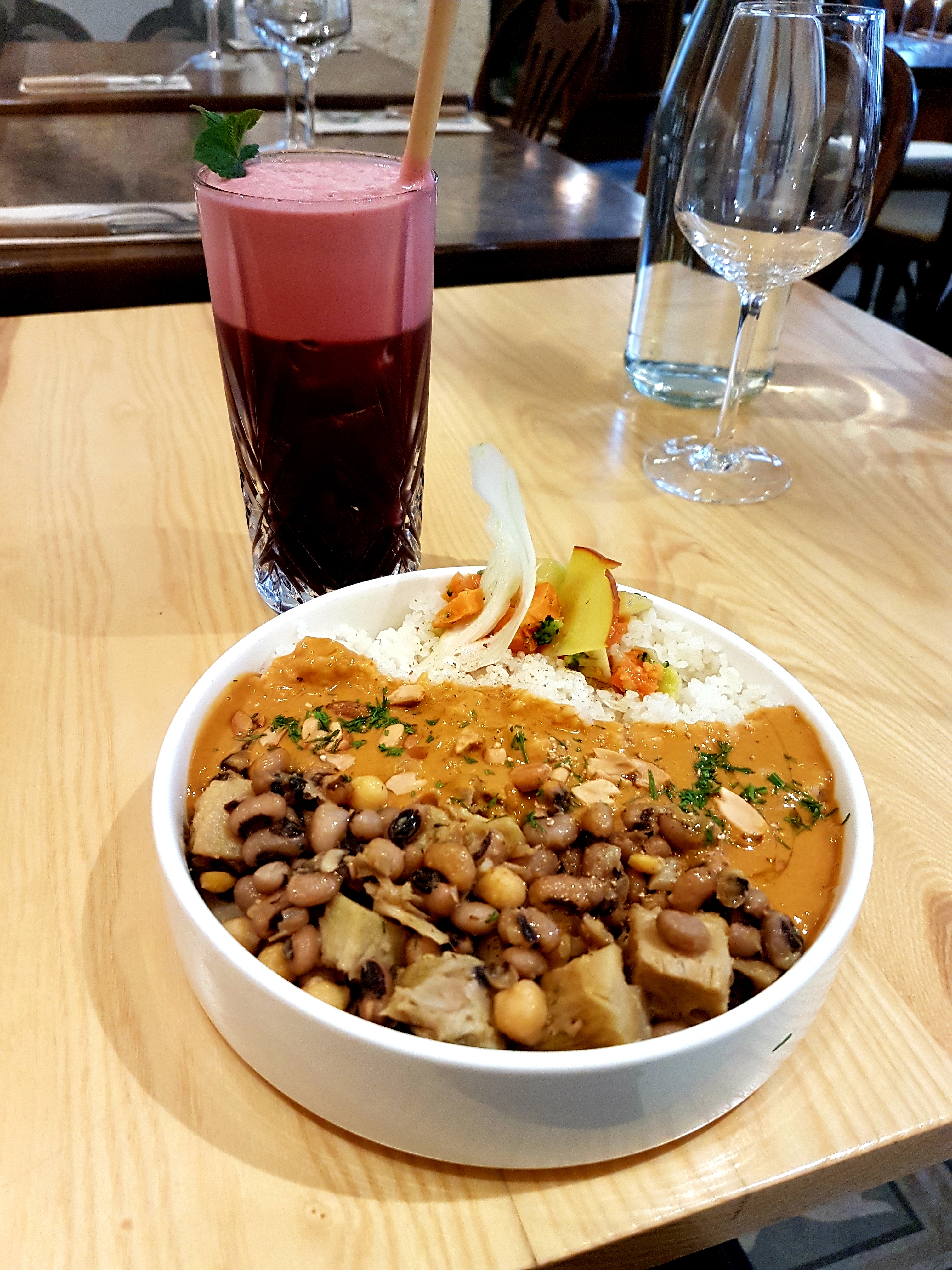 Troisième soirée dans ce restaurant, toujours aussi chouette ! Service attentif et souriant, cocktail épicé juste comme il faut (Poigne hardeur), entrées (salade attiéké figues et gnocchis banane plantain) et plats savoureux (yassa et mafé pintade), avec un p'tit dessert surprenant pour finir sur une note sucrée (Panna cotta mil hibiscus).
