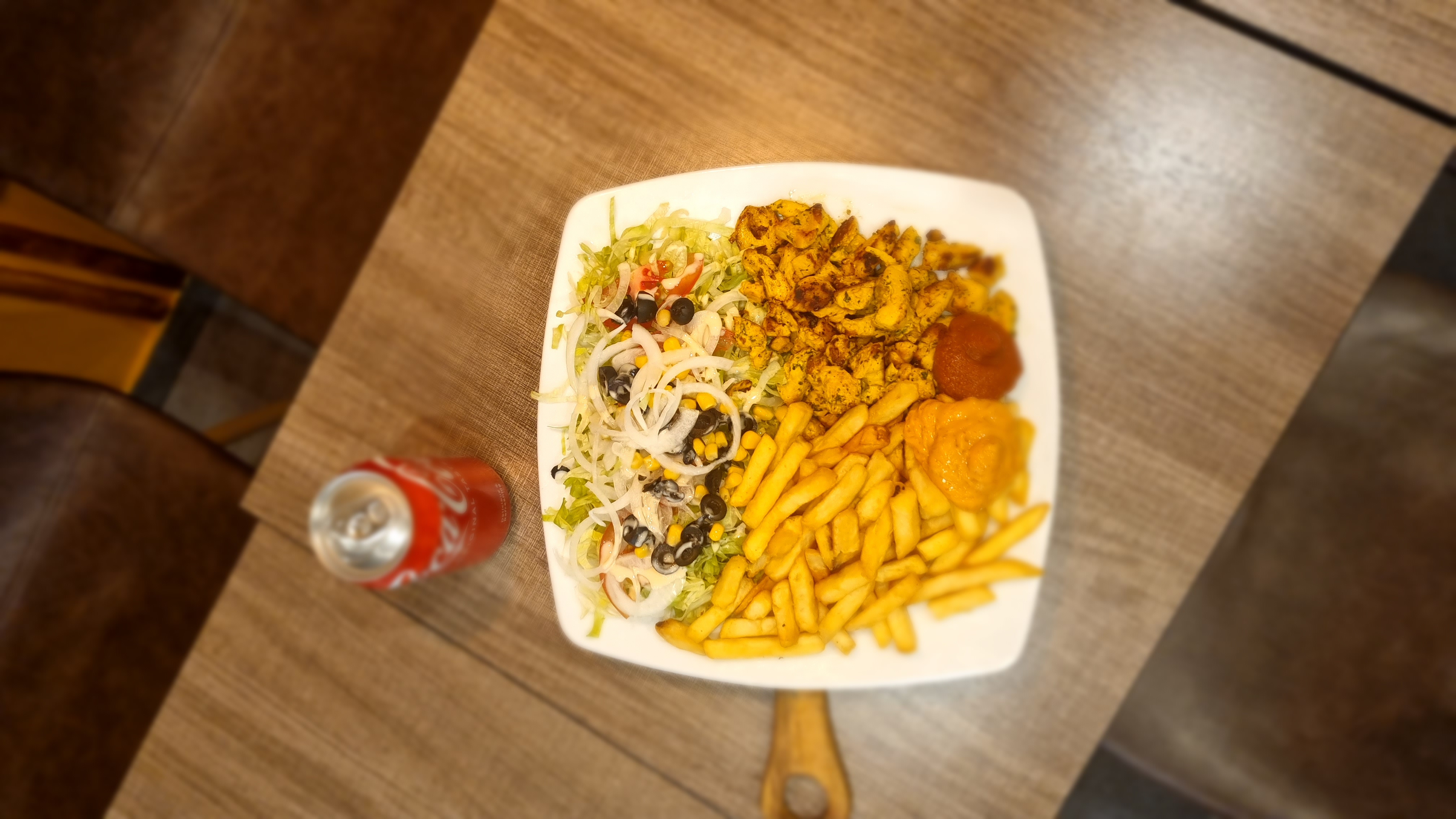 Le poulet est bon mais là quantité est insuffisante, les frites ne sont pas assez cuites et beaucoup trop salées.