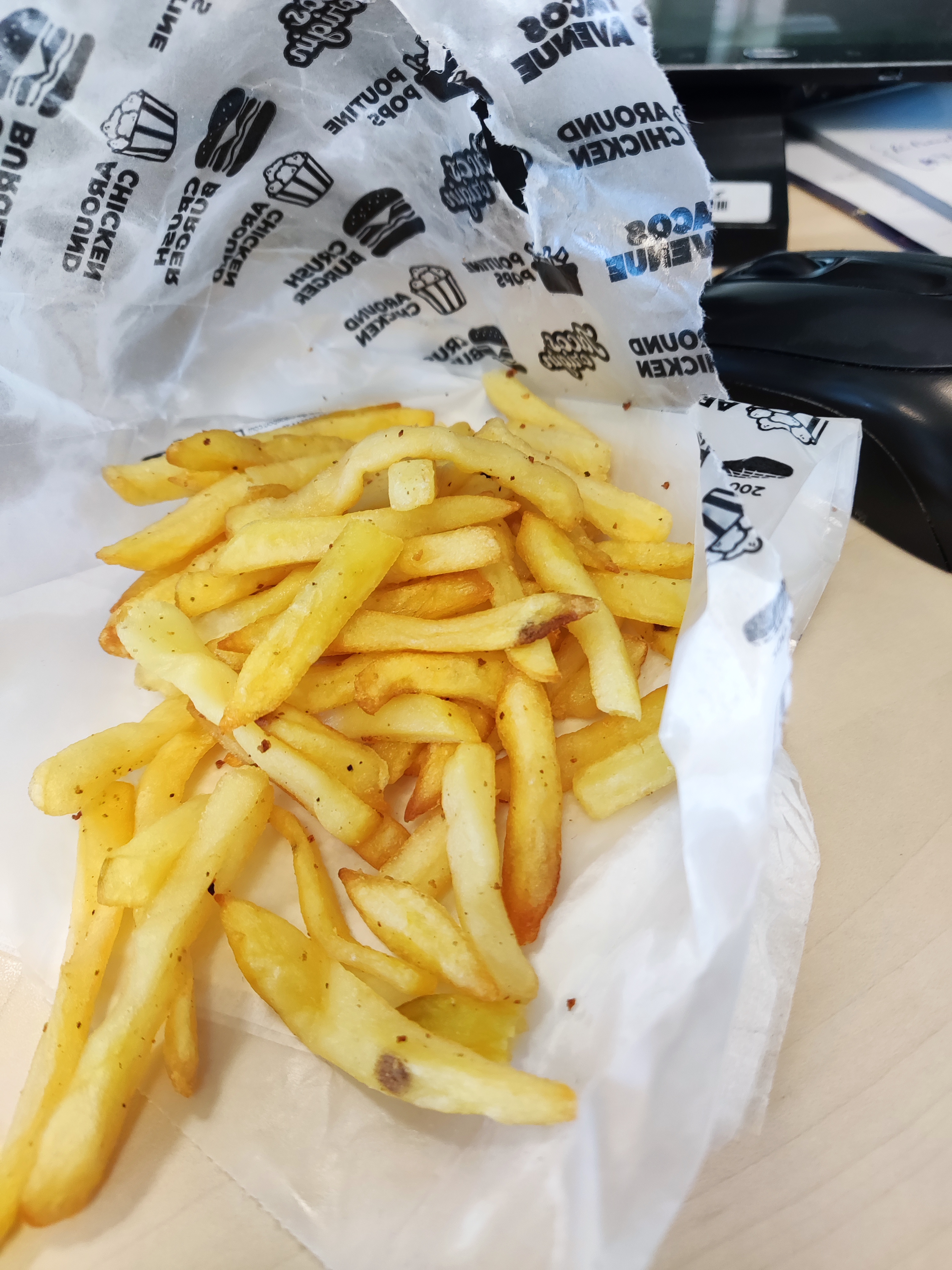 J'avais lu les avis, nombreux à dire qu'ils se trompent souvent dans les commandes j'avais décidé de ne pas en tenir compte voyant la critique du goût positive. En arrivant chez moi je me rends compte que les frites de ma commande ne sont pas là... Pourtant bien payée et encaissée. On était seulement deux à commander, commande commune et simple. C'était pas le rush.. Déception