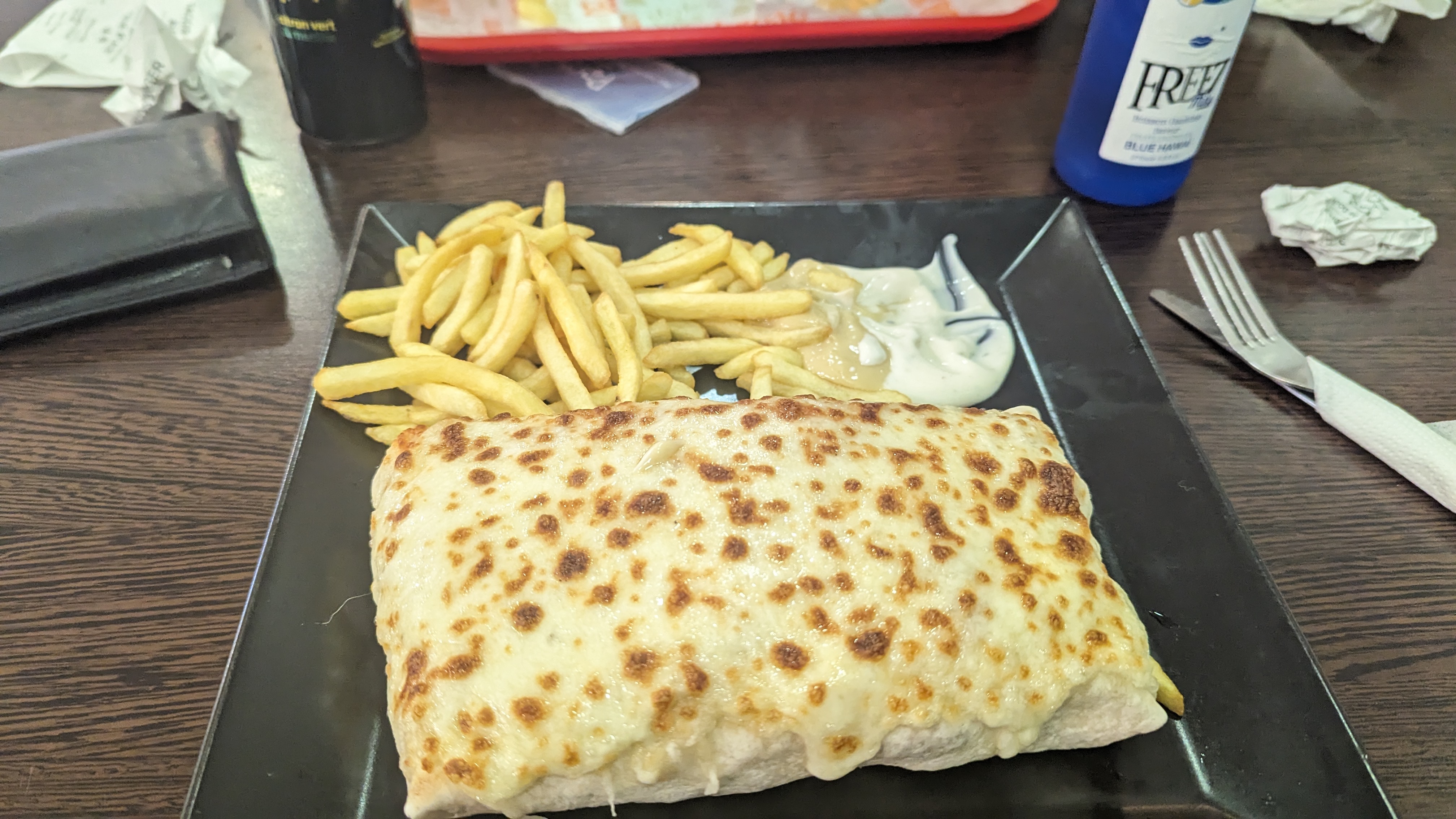 Tacos, melange de poulet curry, patates frites et fromage, dans une crêpe (rigolez pas...). Très mauvais, les patates farineuses on aurait dit tout droit sorti du congélateur. Le plus drôle c'est que pour gratiner le truc ils comptent 1,50Euros, au final avec la boisson j'ai lâché 12 euros pour un machin degueu.......