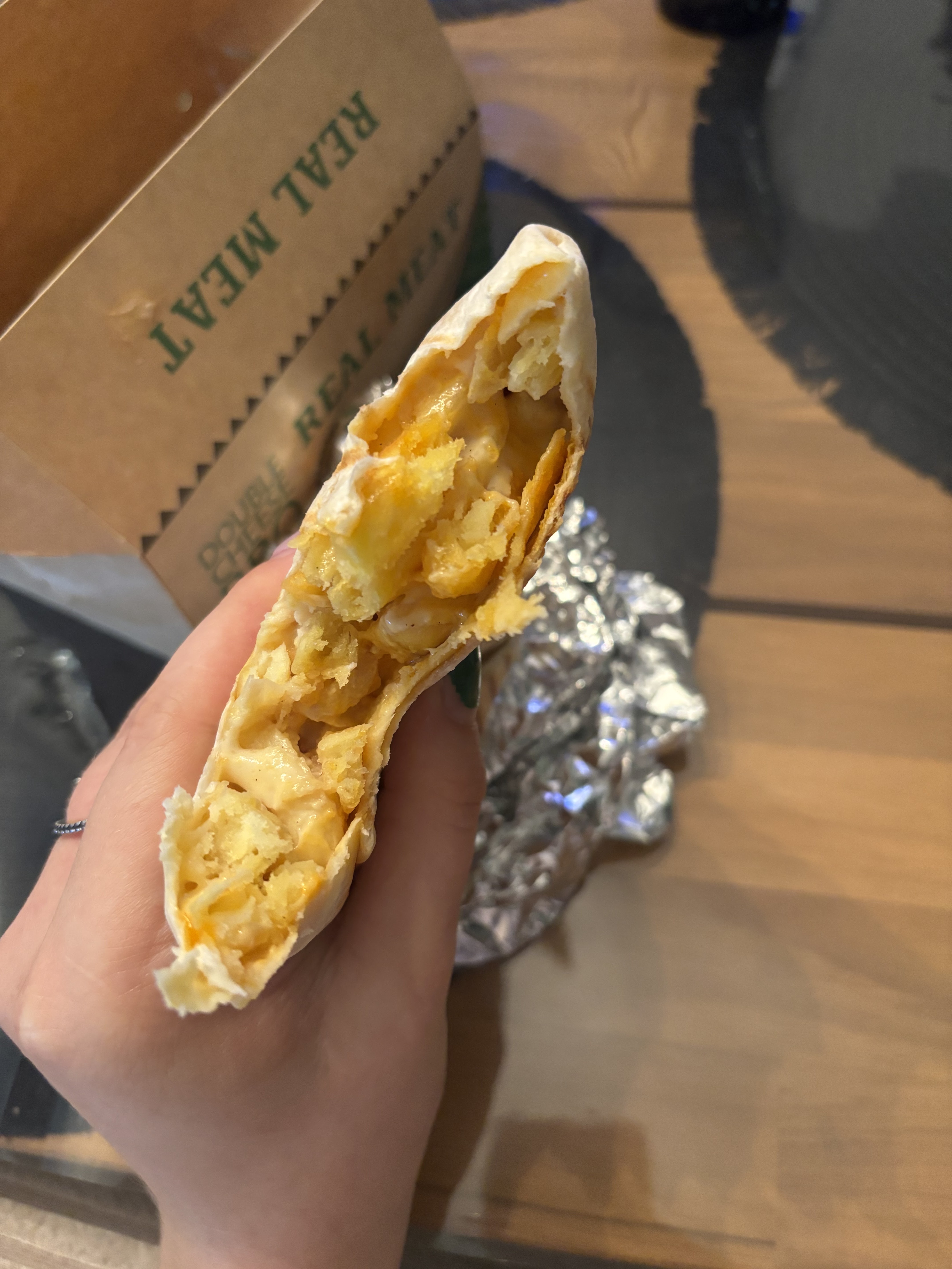 Pourquoi ouvrir une enseigne avec des ingrédients aussi peu qualitatif! Franchement quel déception !! *Sauce fromagère : quelques morceaux de fromages fondu côté gauche, rien dans le fond. C'est pas ça une sauce fromagère ! Désolée ! * Steak haché : sans saveur, sec... Du tout venant aucun jus de cuisson rien, des bouloches... *Galette: bien, mais un peu sèche également (forcement, puisque le steak est tout sec, la sauce fromagère qui n'en ai pas une, on peu pas espérer grand chose) *Les frites: êtes vous vraiment obligé de servir les mêmes que chez MacDo?! C'est ce qu'il y a de pire!! Dégoûtée ! Ceux qui aiment ça doivent manger surgelé, du cracra chez eux. C'est pas possible autrement. Bref, Une enseigne de plus, sans amour de la cuisine, une énième pompe à fric avec un beau local, rien d'autre ! Allez plutôt au MK à l'éléphant bleu, vous verrez ce qu'est un vrai tacos! 1ere et dernière fois, super déçue.