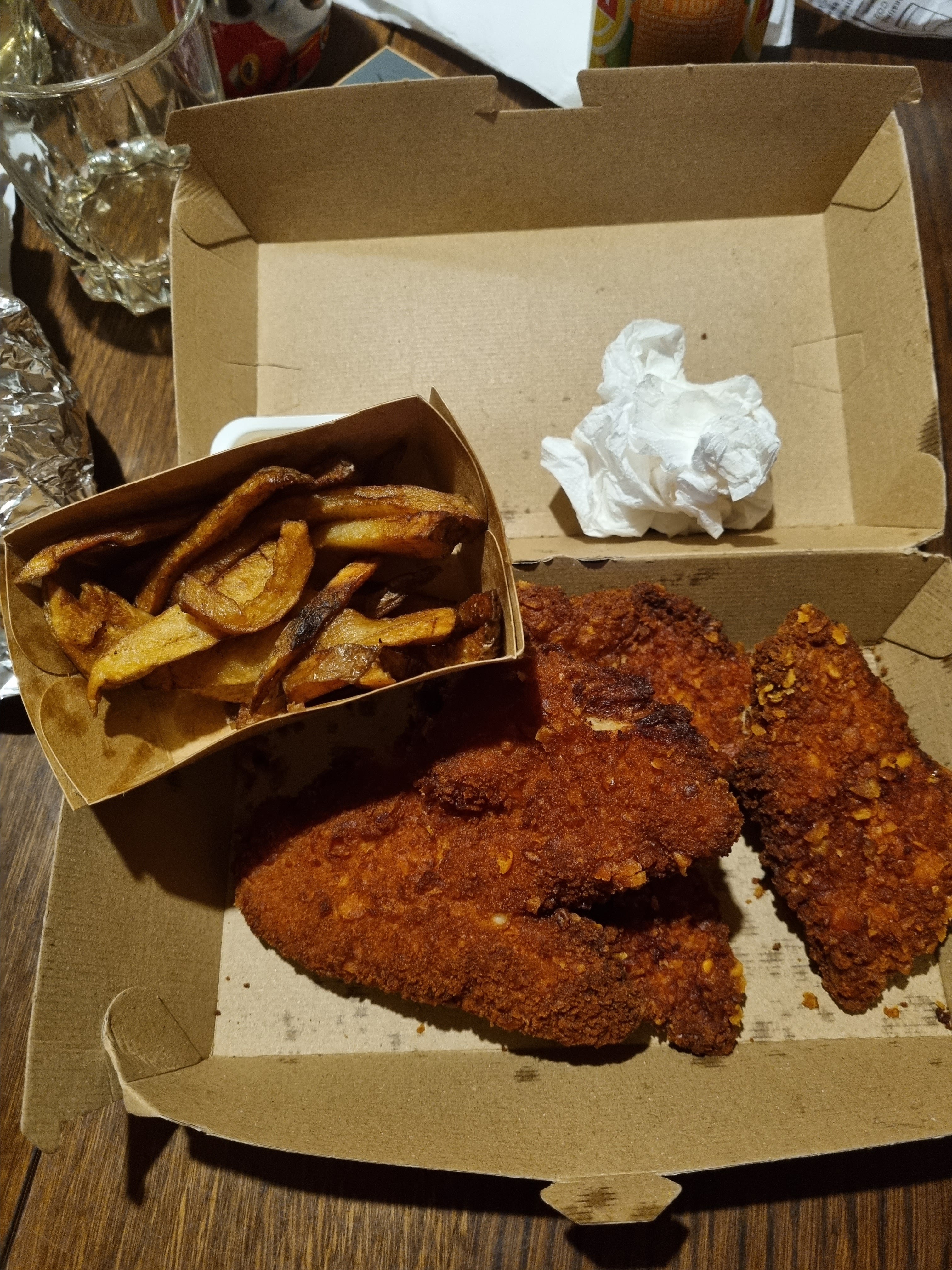 Les wings étaient cramés de l’extérieur mais rouge à l’intérieur voir cru, le tacos est farineux, trop garni et sans assaisonnement. Un poulet pané trop sec et sans assaisonnement également. Changez de cuisinier !