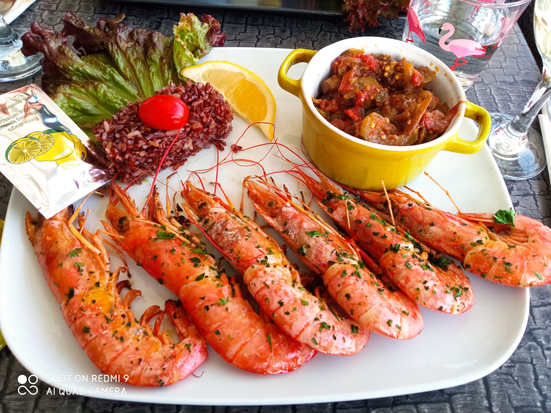 Ravis de notre déjeuner ce lundi midi au restaurant l improviste idéalement situé face à la mer dans un cadre intimiste à l abri de la cohue Couteaux en persillade frais un vrai délice Daurade avec son riz camarguais et poêlon de légumes, salicornes des saveurs qui se marient idéalement entre elles Et bien sûr la gardianne de taureau très goûteuse Sabayon de fruits Rouges fait maison un régal des papilles Moelleux au chocolat classique mais tellement bon Et la fougasse d aigues mortes accompagnée de sa glace vanille Allez-y sans hésiter L accueil est très sympathique et les poissons sont de la pêche du jour Mention spéciale pour les frites maison