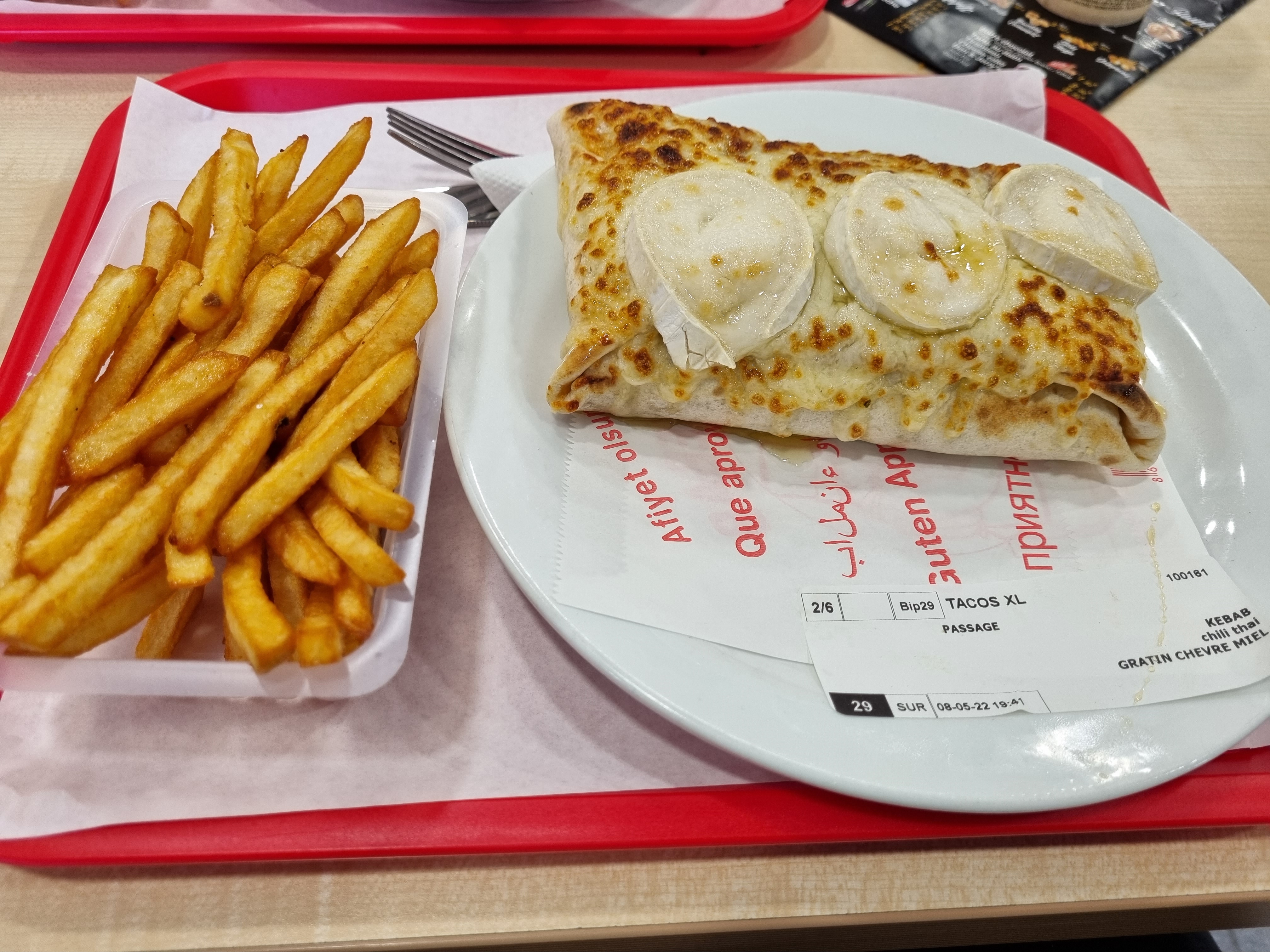 Un menu tacos L, Les frites industrielle molle, la sauce blanche on dirait de l'eau vraiment je déconseille ; le tacos en revanche rattrape le reste,les tenders relevé c'est sympa mais pas non plus incroyable,pour le prix c'est correct mais le niveau général n'est pas la.