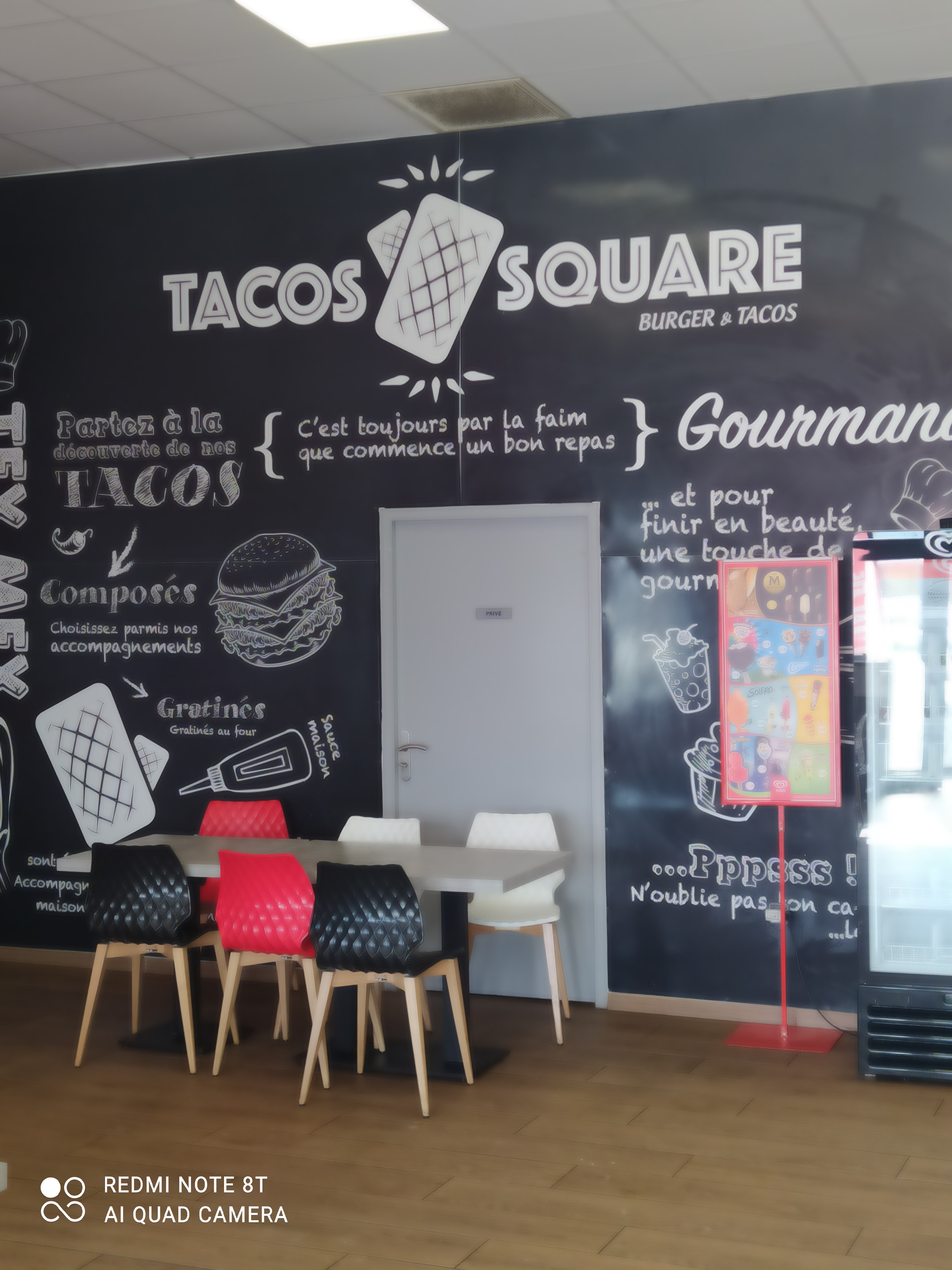 Restau très sympa, grand et lumineux, le personnel est aimable et compétent, recettes avec du choix et personnalisation possible. Les tacos sont copieux à un prix très raisonnable et la viande très bonne. Les sauces sont excellentes (micro remarque : dans le cas de mon tacos poulet/kebab, peut être un poil trop riche en sauce ;)) les frites sont très bien également, je reviendrais avec plaisir chez Tacos Square ;)