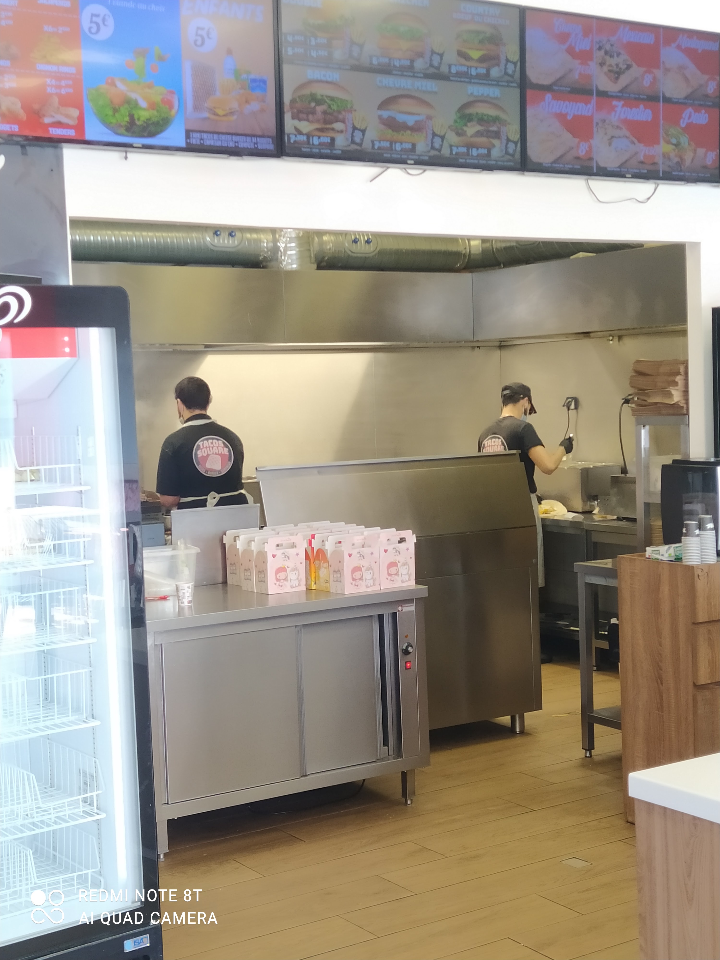 Nous avons commandé a emporter. Belle accueil, souriante et agréable. Grande salle, lumineuse et propre. Les cuisiniers en arrière plan, tous avec une charlotte, servir rapide. Et pour finir l'essentiel bon tacos. Merci, ne changez rien.