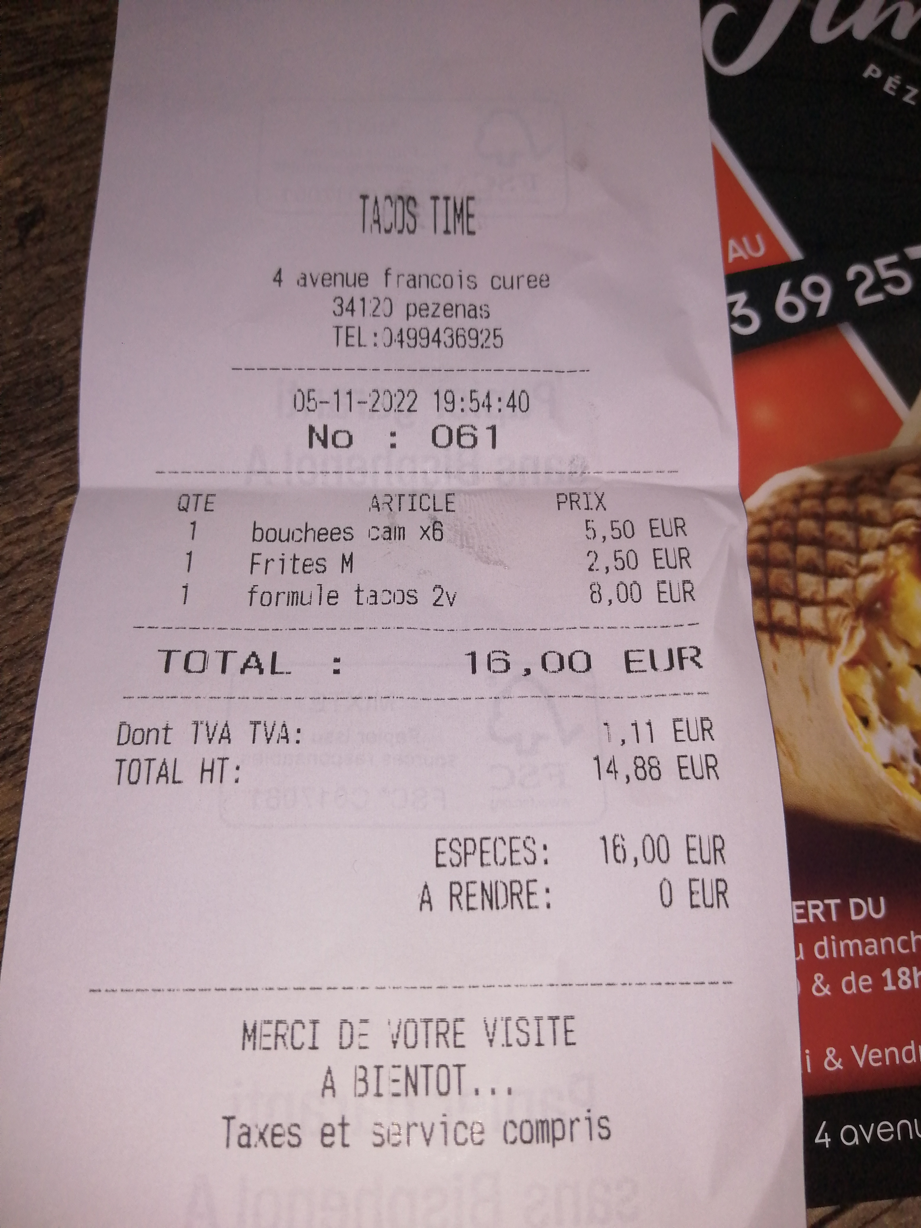 Lors d'un passage à Pézenas, je suis tombé par hasard sur ce snack. La première chose qui saute aux yeux c'est la propreté de l'établissement.La qualité du service est au rendez vous pour un prix raisonnable vous sortirez de Tacos Time repu.L'équipe est jeune et dynamique ce qui fait plaisir