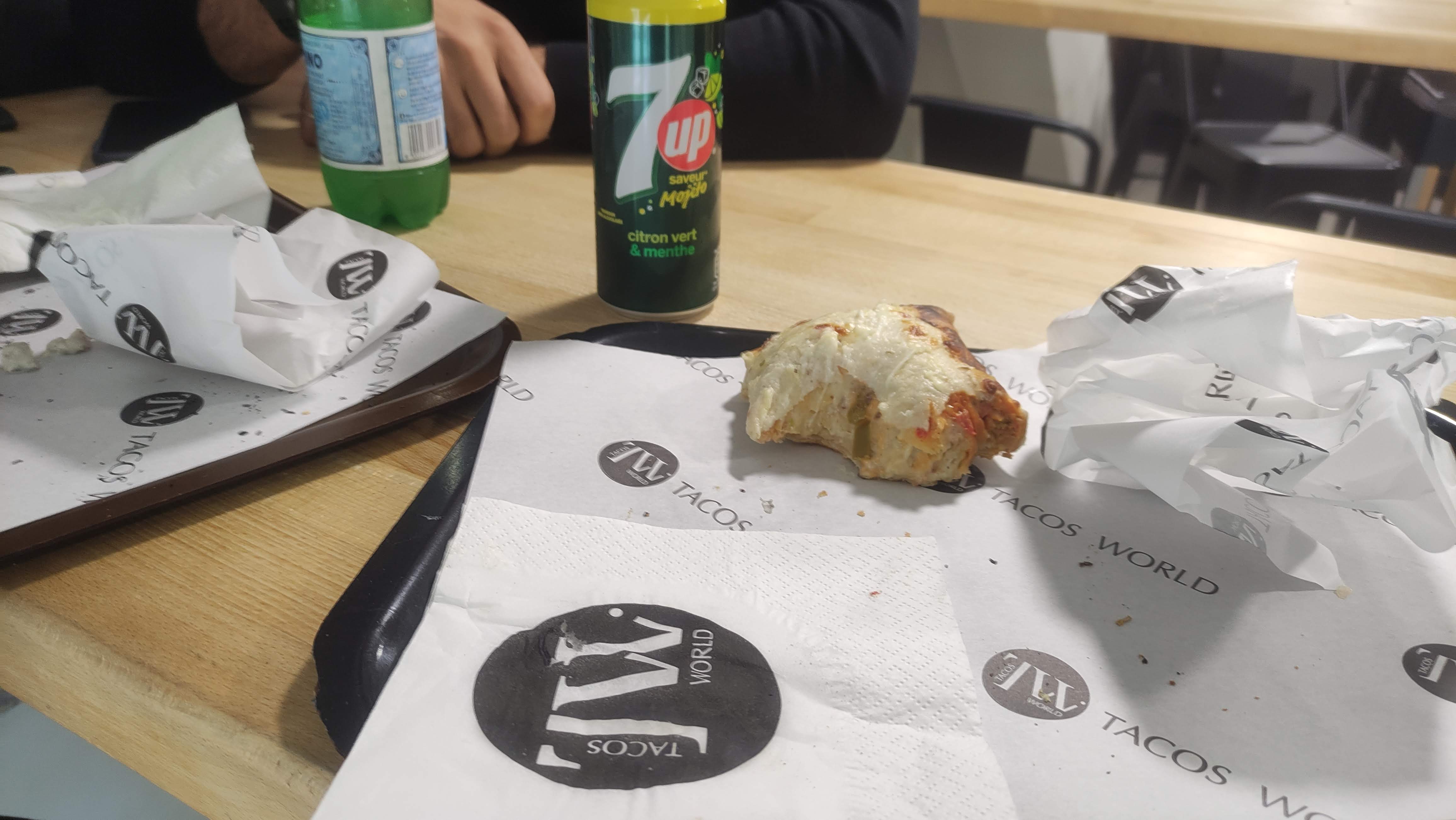 Ces derniers temps je dois économiser. La dernière chose que j'ai sacrifiée était tacos world. C'est le meilleur tacos que j'aie jamais mangé. Je tiens à préciser qe je suis végétarien. Souvent ça fait qe les tacos sont moins bons, mais dieu bénisse le chakchouka falafel sauce samourai barbecue. La galette est délicieuse, à la limite parfaite entre croustillante et fondante. La chakchouka est simplement un don du ciel. Je dois raconter deux anecdotes pour prouver à quel point tacos world est une perle. J'invite deux potes au tacos world en leur disant que c'est délicieux. Pendant tout le repas on a fait que parler de tacos, des meilleurs qu'on avait mangés etc. C'est ça tacos world : ça vous force à vous remémorer tous les goûts délicieux que vous avez croisés. C'est pour les vrais amoureux de tacos, et les vrais sauront reconnaître la supériorité de ce tacos. Je pars du tacos avec ma commande. Je fais 150 mètres. Un des employés m'appelle en courant vers moi. Romain Romain ! (depuis quelques temps on connait mon prénom, ils sont extrêmement gentils) je me retourne, il me dit T'as oublié tes camemberts ! Oh mon Dieu, comment ai-je pu oublier des camemberts crispy tellement bons que je les prends à chaque fois ? Je retourne, ils me les donnent. Je vous mets au défi de trouver des tacossiers aussi impliqués. Tacos world pour toujours