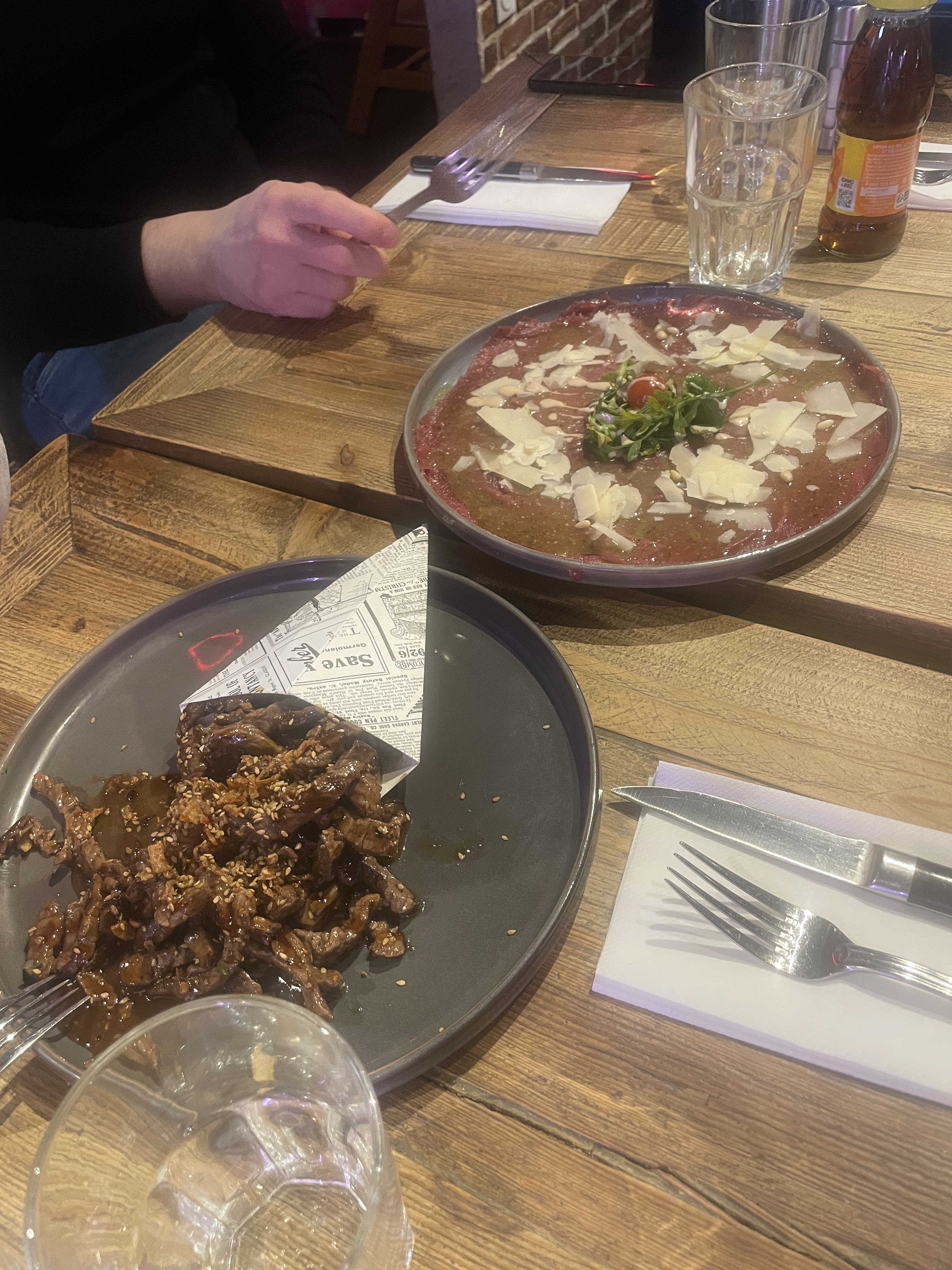Préparez vous à manger un carpaccio d’exception et pour la viande maturé la prendre saignante elle est excellente du beurre ! La salle est un petite du coup prévoir de venir tôt ! Sinon il faudra attendre !