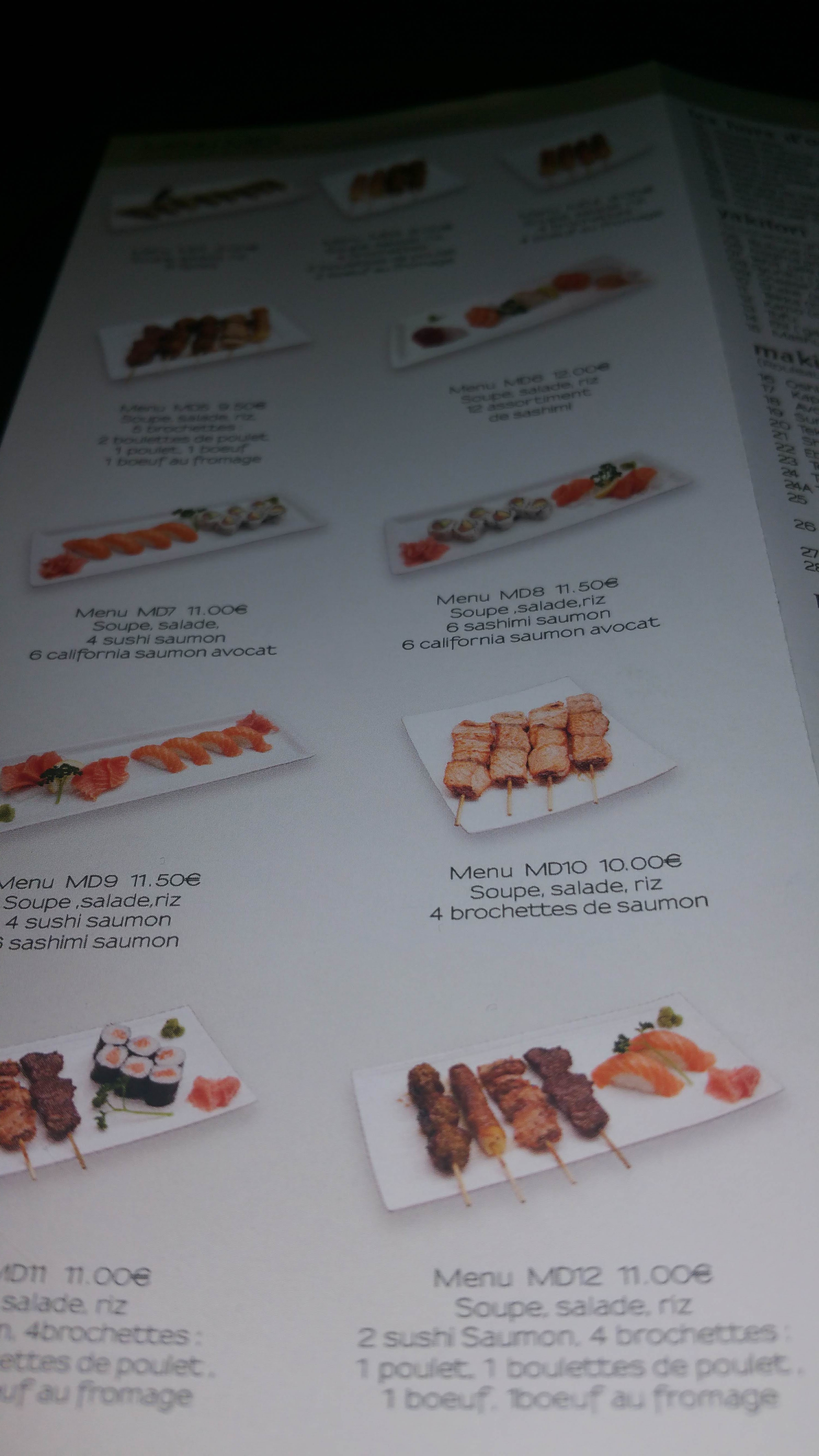 Le personnel pas très accueillant! Nous avons mangé sur place mes enfants et moi. Les soupes n’avait pas de goût… les makis étaient pâteuses pas de goût non plus… dommage! Les brochettes de mon fils étaient très bonnes les gyoza étaient bon également.