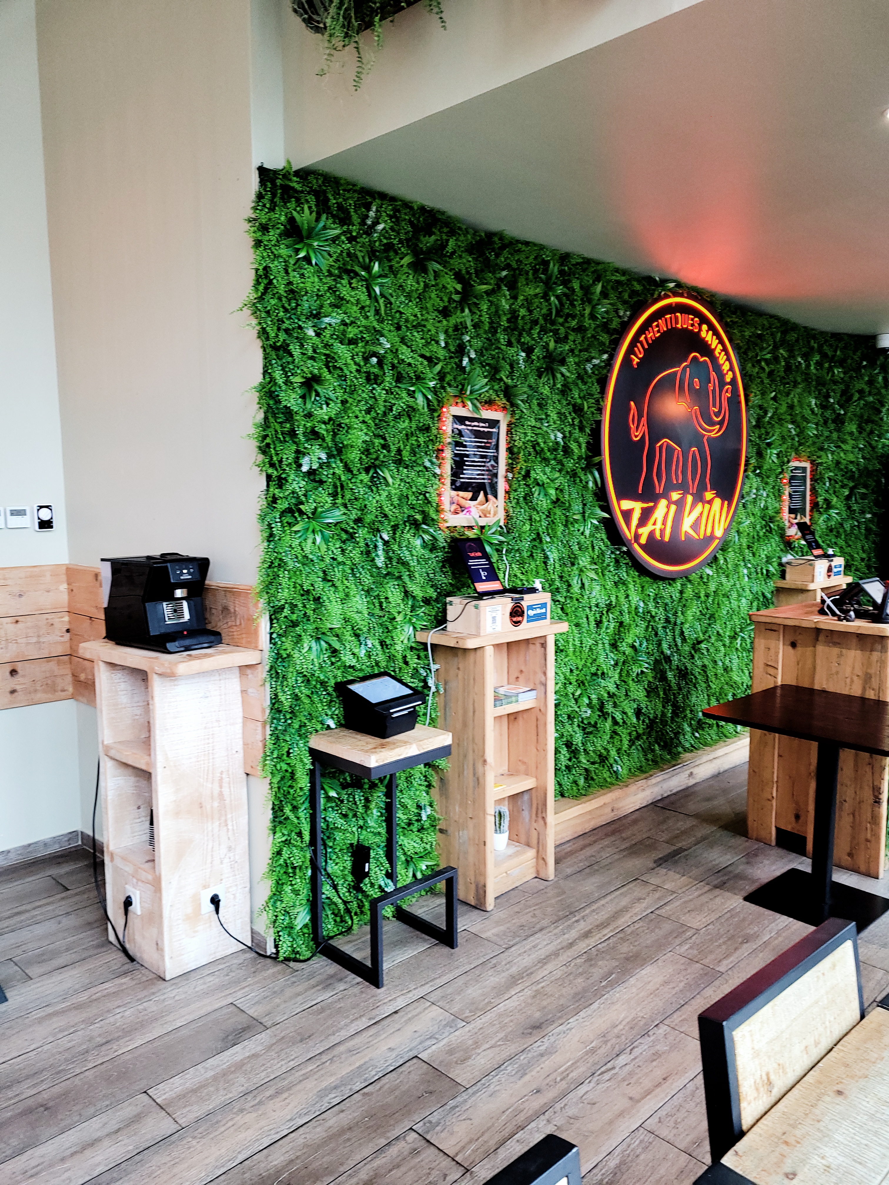 Cet endroit mi fast- food mi-restaurant n’a l’air que d’un fast food dans la façon d’effectuer sa commande ! En effet, grâce à deux tablettes mises à disposition vous pouvez directement commander votre menu/plat et y ajouter des commentaires si nécessaire ( par exemple : mettre plus de lait de Coco pour pas que le plat soit trop fort etc), la vaisselle y est jetable et biodégradable. La cuisine semi- ouverte, la décoration très chill de part son mur de végétation artificiel mais également avec son extérieur grace a de petits parasols donnant à ce lieu un environnement très agréable. Concernant les plats, nous y étions à 5 et tout le monde a adoré, d’autant plus que ceux-ci sont très généreux dans les quantités ! On aime : la quantité, la qualité des produits et le choix quasi à chaque fois entre crevette/ poulet/ bœuf ou tofu On aime moins : le temps d’attente pour les plats, cependant ceux-ci sont fait à la minute alors on vous pardonne ;) On recommande, et on y retournera les yeux fermés !