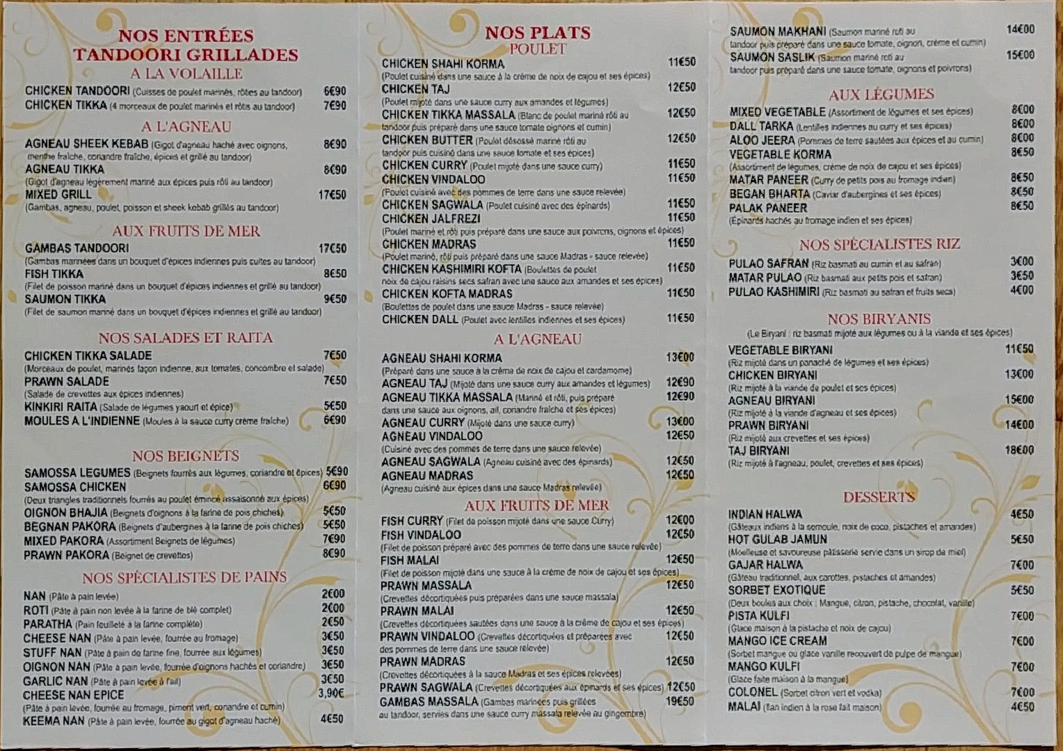 Excellent indien, nous commandons régulièrement chez eux . Les portions sont généreuses, les plats goûtus. Pour info la carte du site Web n'est pas à jour par rapport au dernier flyer (voir photo).